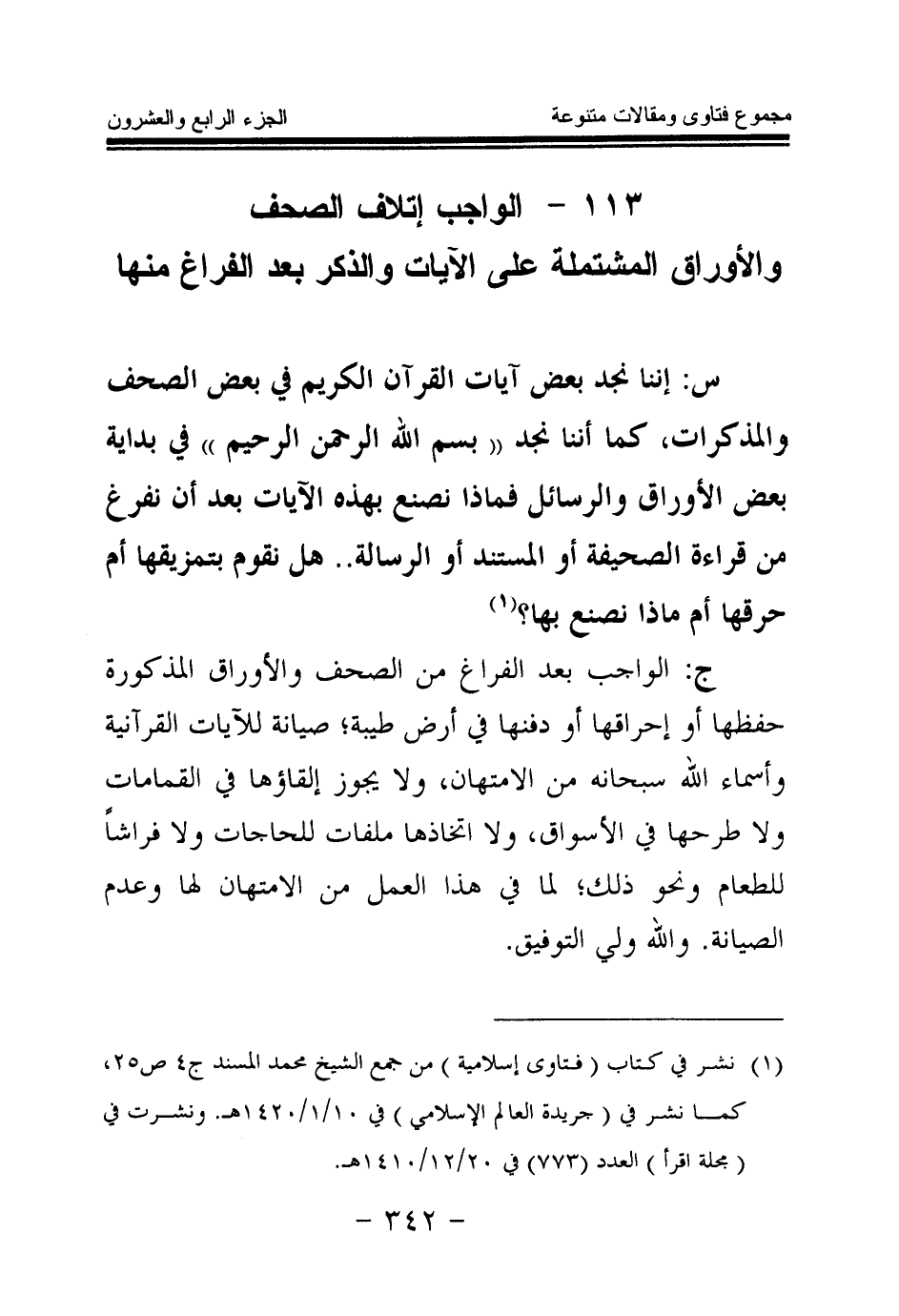 113 - الواجب إتلاف الصحف والأوراق المشتملة على الآيات والذكر بعد الفراغ منها