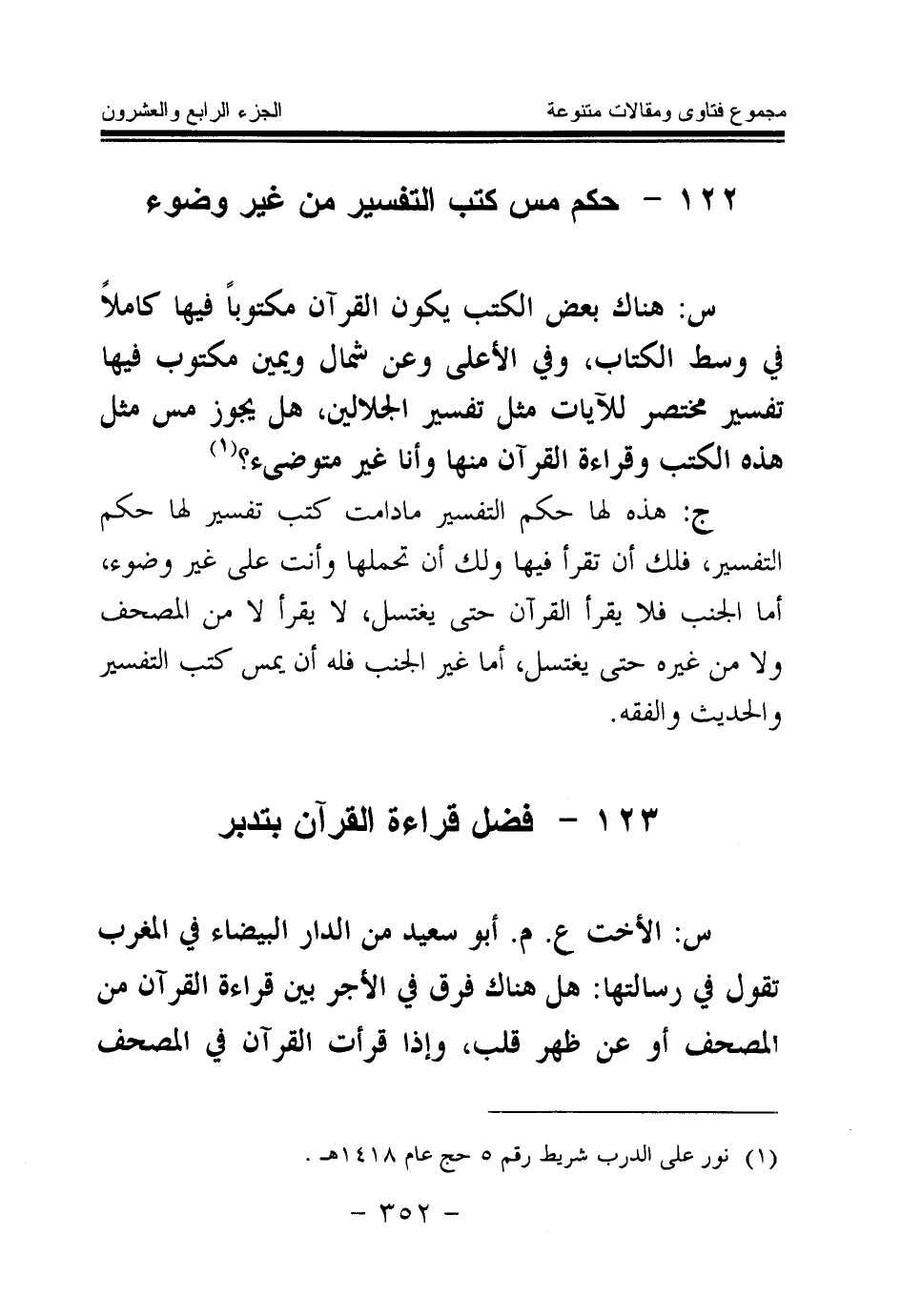 س: هناك بعض الكتب يكون القرآن مكتوبا فيها كاملا في وسط الكتاب، وفي الأعلى وعن شمال ويمين مكتوب فيها تفسير مختصر للآيات مثل تفسير الجلالين، هل يجوز مس مثل هذه الكتب وقراءة القرآن منها وأنا غير متوضئ؟ (¬1) .