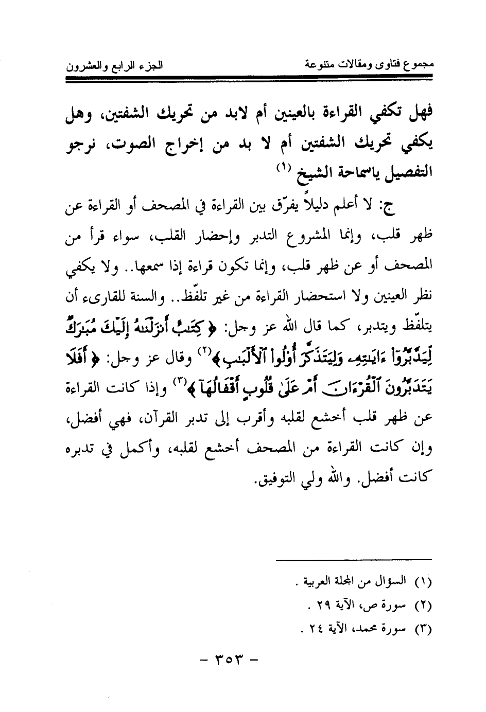 فهل تكفي القراءة بالعينين أم لا بد من تحريك الشفتين، وهل يكفي تحريك الشفتين أم لا بد من إخراج الصوت، نرجو التفصيل يا سماحة الشيخ (¬1) .