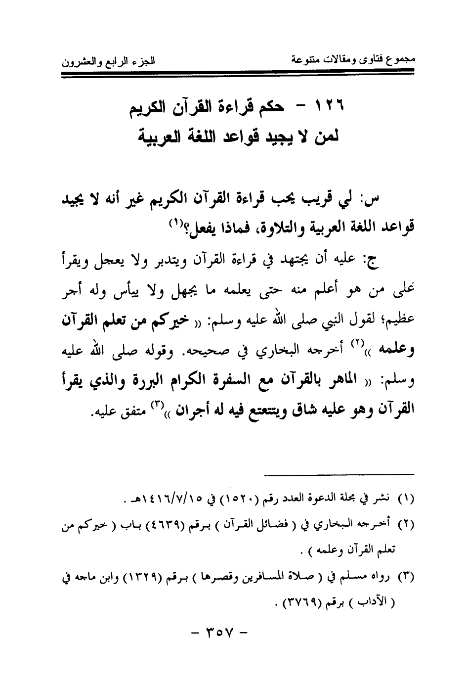 126 - حكم قراءة القرآن الكريم لمن لا يجيد قواعد اللغة العربية