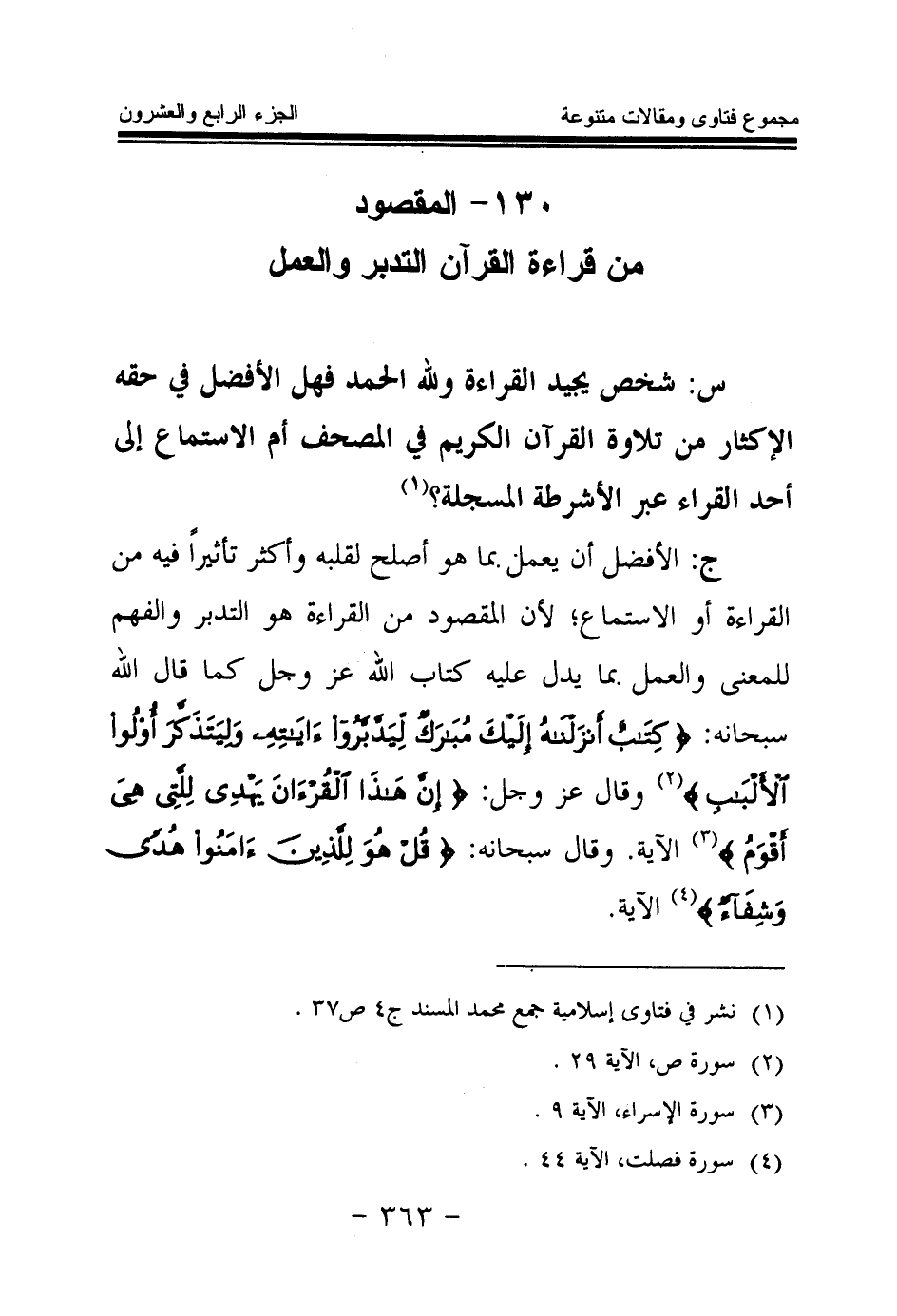 ج: الأفضل أن يعمل بما هو أصلح لقلبه وأكثر تأثيرا فيه من القراءة أو الاستماع؛ لأن المقصود من القراءة هو التدبر والفهم للمعنى والعمل بما يدل عليه كتاب الله عز وجل كما قال الله سبحانه: {كِتَابٌ أَنْزَلْنَاهُ إِلَيْكَ مُبَارَكٌ لِيَدَّبَّرُوا آيَاتِهِ وَلِيَتَذَكَّرَ أُولُو الْأَلْبَابِ} (¬2) وقال عز وجل: {إِنَّ هَذَا الْقُرْآنَ يَهْدِي لِلَّتِي هِيَ أَقْوَمُ} (¬3) الآية. وقال سبحانه: {قُلْ هُوَ لِلَّذِينَ آمَنُوا هُدًى وَشِفَاءٌ} (¬4) الآية.