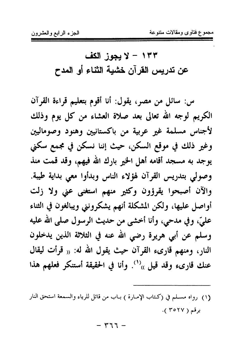 133 - لا يجوز الكف عن تدريس القرآن خشية الثناء أو المدح