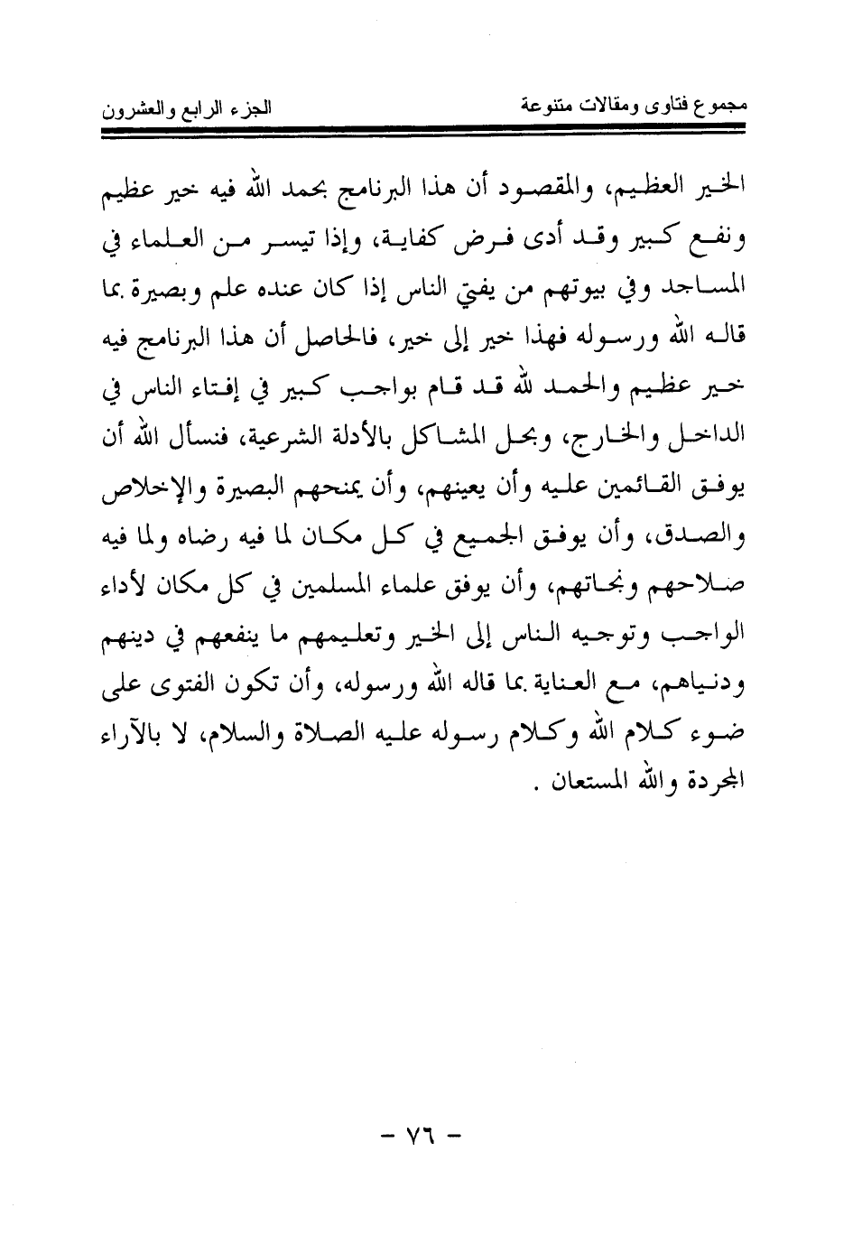 الخير العظيم، والمقصود أن هذا البرنامج بحمد الله فيه خير عظيم ونفع كبير وقد أدى فرض كفاية، وإذا تيسر من العلماء في المساجد وفي بيوتهم من يفتي الناس إذا كان عنده علم وبصيرة بما قاله الله ورسوله فهذا خير إلى خير، فالحاصل أن هذا البرنامج فيه خير عظيم والحمد لله قد قام بواجب كبير في إفتاء الناس في الداخل والخارج، وبحل المشاكل بالأدلة الشرعية، فنسأل الله أن يوفق القائمين عليه وأن يعينهم، وأن يمنحهم البصيرة والإخلاص والصدق، وأن يوفق الجميع في كل مكان لما فيه رضاه ولما فيه صلاحهم ونجاتهم، وأن يوفق علماء المسلمين في كل مكان لأداء الواجب وتوجيه الناس إلى الخير وتعليمهم ما ينفعهم في دينهم ودنياهم، مع العناية بما قاله الله ورسوله، وأن تكون الفتوى على ضوء كلام الله وكلام رسوله عليه الصلاة والسلام، لا بالآراء المجردة والله المستعان.