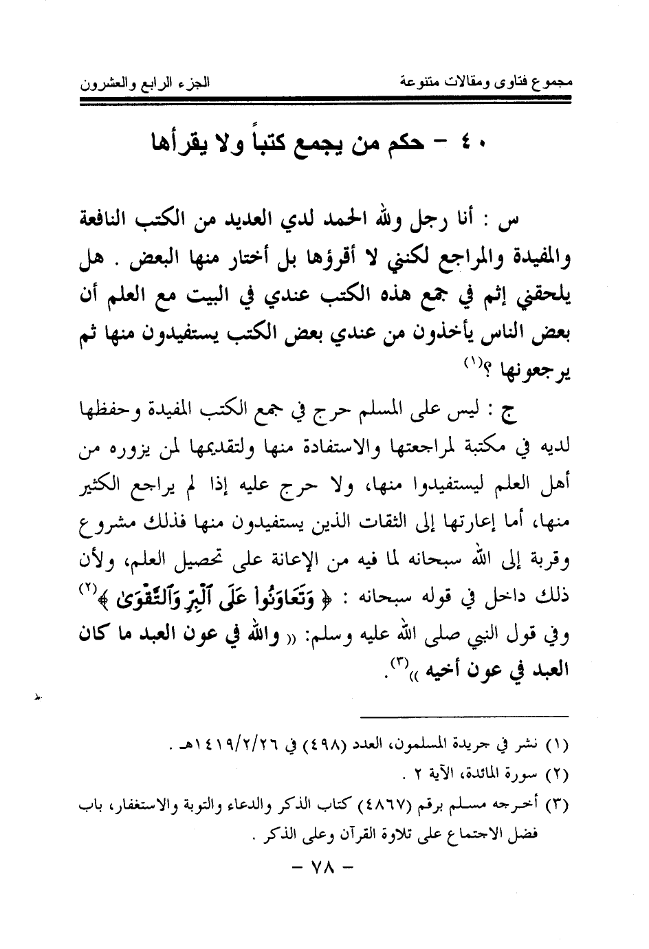 ج: ليس على المسلم حرج في جمع الكتب المفيدة وحفظها لديه في مكتبة لمراجعتها والاستفادة منها ولتقديمها لمن يزوره من أهل العلم ليستفيدوا منها، ولا حرج عليه إذا لم يراجع الكثير منها، أما إعارتها إلى الثقات الذين يستفيدون منها فذلك مشروع وقربة إلى الله سبحانه لما فيه من الإعانة على تحصيل العلم، ولأن ذلك داخل في قوله سبحانه: {وَتَعَاوَنُوا عَلَى الْبِرِّ وَالتَّقْوَى} (¬2) وفي قول النبي صلى الله عليه وسلم: «والله في عون العبد ما كان العبد في عون أخيه (¬3) » .