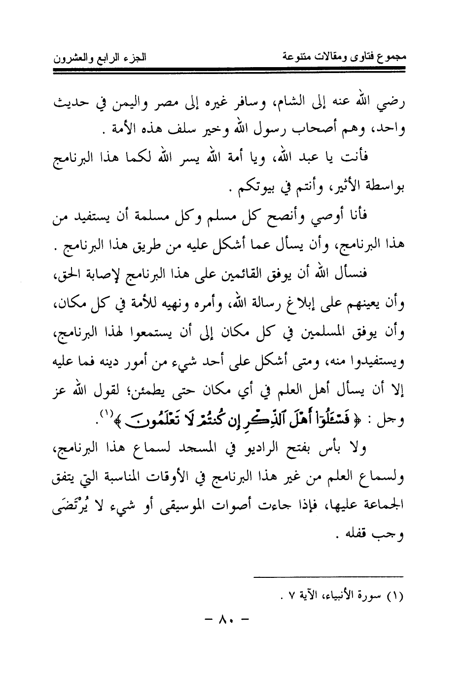 فأنا أوصي وأنصح كل مسلم وكل مسلمة أن يستفيد من هذا البرنامج، وأن يسأل عما أشكل عليه من طريق هذا البرنامج، فنسأل الله أن يوفق القائمين على هذا البرنامج لإصابة الحق، وأن يعينهم على إبلاغ رسالة الله، وأمره ونهيه للأمة في كل مكان، وأن يوفق المسلمين في كل مكان إلى أن يستمعوا لهذا البرنامج، ويستفيدوا منه، ومتى أشكل على أحد شيء من أمور دينه فما عليه إلا أن يسأل أهل العلم في أي مكان حتى يطمئن؛ لقول الله عز رجل: {فَاسْأَلُوا أَهْلَ الذِّكْرِ إِنْ كُنْتُمْ لَا تَعْلَمُونَ} (¬1)