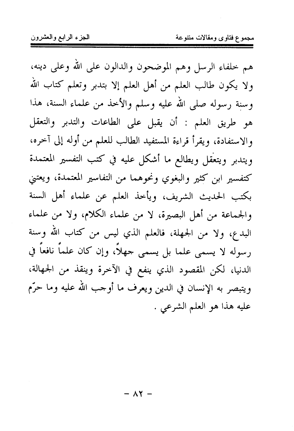 هم خلفاء الرسل وهم الموضحون والدالون على الله وعلى دينه، ولا يكون طالب العلم من أهل العلم إلا بتدبر وتعلم كتاب الله وسنة رسوله صلى الله عليه وسلم والأخذ من علماء السنة، هذا هو طريق العلم: أن يقبل على الطاعات والتدبر والتعقل والاستفادة، ويقرأ قراءة المستفيد الطالب للعلم من أوله إلى آخره، ويتدبر ويتعقل ويطالع ما أشكل عليه في كتب التفسير المعتمدة كتفسير ابن كثير والبغوي ونحوهما من التفاسير المعتمدة، ويعتني بكتب الحديث الشريف، ويأخذ العلم عن علماء أهل السنة والجماعة من أهل البصيرة، لا من علماء الكلام، ولا من علماء البدع، ولا من الجهلة، فالعلم الذي ليس من كتاب الله وسنة رسوله لا يسمى علما بل يسمى جهلا، وإن كان علما نافعا في الدنيا، لكن المقصود الذي ينفع في الآخرة وينقذ من الجهالة، ويتبصر به الإنسان في الدين ويعرف ما أوجب الله عليه وما حرم عليه هذا هو العلم الشرعي.