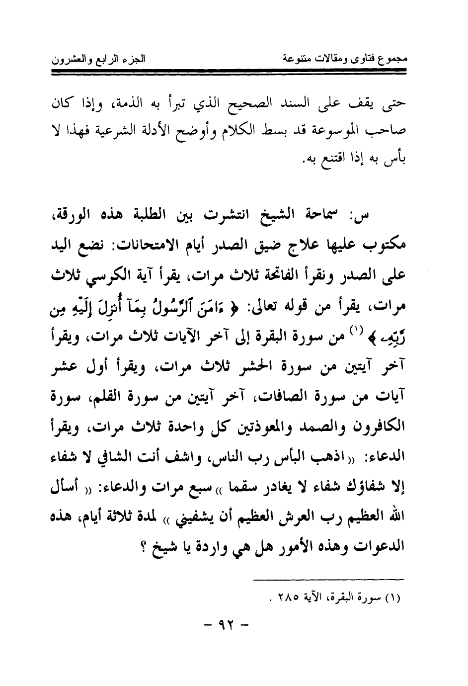 س: سماحة الشيخ انتشرت بين الطلبة هذه الورقة، مكتوب عليها علاج ضيق الصدر أيام الامتحانات: نضع اليد على الصدر ونقرأ الفاتحة ثلاث مرات، يقرأ آية الكرسي ثلاث مرات، يقرأ من قوله تعالى: {آمَنَ الرَّسُولُ بِمَا أُنْزِلَ إِلَيْهِ مِنْ رَبِّهِ} (¬1) من سورة البقرة إلى آخر الآيات ثلاث مرات، ويقرأ آخر آيتين من سورة الحشر ثلاث مرات، ويقرأ أول عشر آيات من سورة الصافات، آخر آيتين من سورة القلم، سورة الكافرون والصمد والمعوذتين كل واحدة ثلاث مرات، ويقرأ الدعاء: أذهب الباس رب الناس، واشف أنت الشافي لا شفاء إلا شفاؤك شفاء لا يغادر سقما سبع مرات والدعاء: " أسأل الله العظيم رب العرش العظيم أن يشفيني لمدة ثلاثة أيام، هذه الدعوات وهذه الأمور هل هي واردة يا شيخ؟