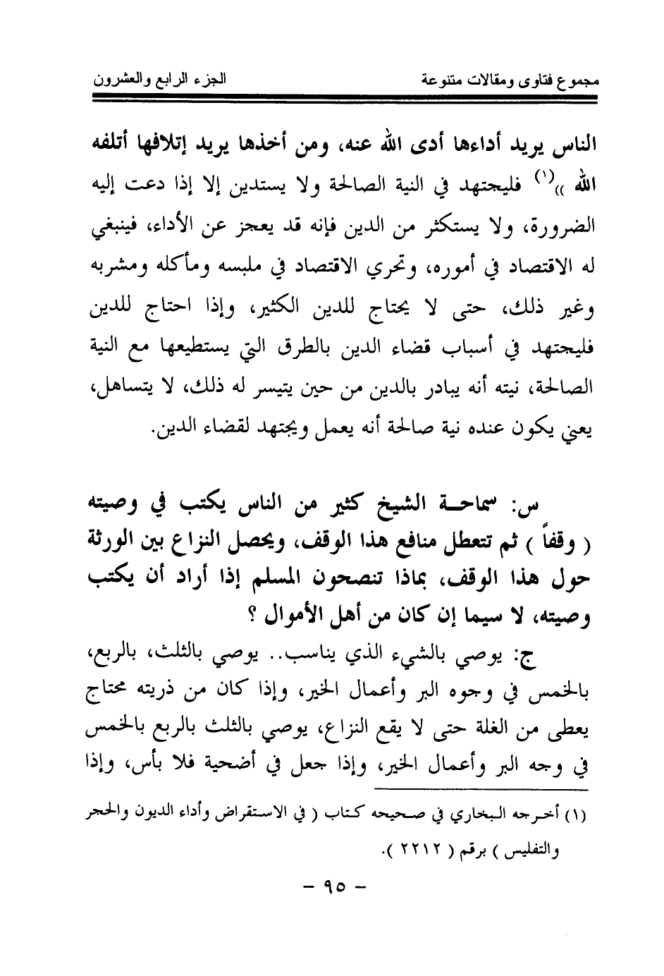 الناس يريد أداءها أدى الله عنه، ومن أخذها يريد إتلافها أتلفه الله (¬1) » . فليجتهد في النية الصالحة ولا يستدين إلا إذا دعت إليه الضرورة، ولا يستكثر من الدين فإنه قد يعجز عن الأداء، فينبغي له الاقتصاد في أموره، وتحري الاقتصاد في ملبسه ومأكله ومشربه وغير ذلك، حتى لا يحتاج للدين الكثير، وإذا احتاج للدين فليجتهد في أسباب قضاء الدين بالطرق التي يستطيعها مع النية الصالحة، نيته أنه يبادر بالدين من حين يتيسر له ذلك، لا يتساهل، يعني يكون عنده نية صالحة أنه يعمل ويجتهد لقضاء الدين.