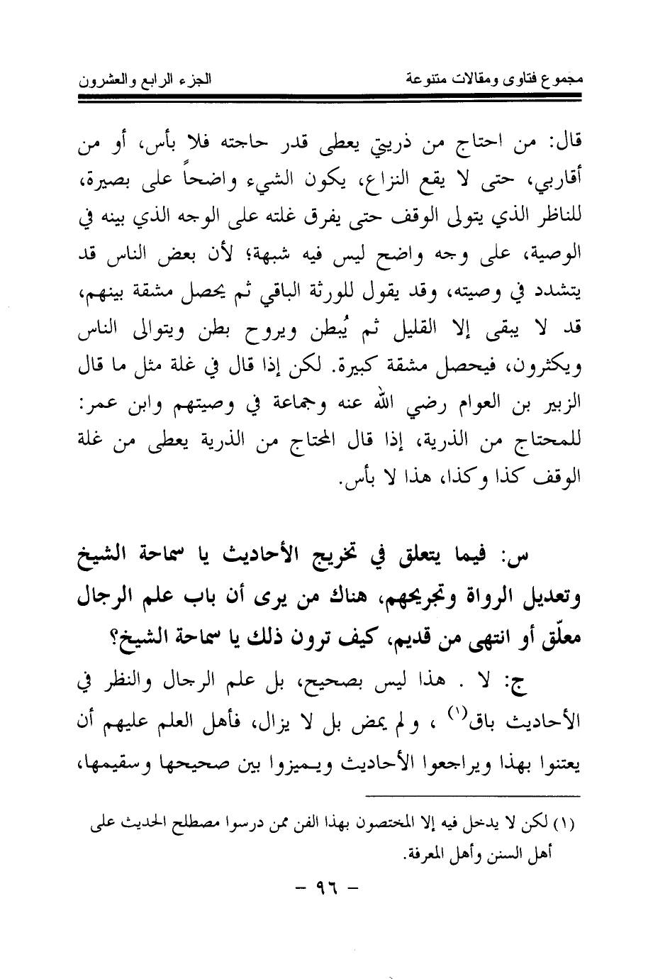 قال: من احتاج من ذريتي يعطى قدر حاجته فلا بأس، أو من أقاربي حتى لا يقع النزاع، يكون الشيء واضحا على بصيرة للناظر الذي يتولى الوقف حتى يفرق غلته على الوجه الذي بينه في الوصية، على وجه واضح ليس فيه شبهة؛ لأن بعض الناس قد يتشدد في وصيته، وقد يقول: للورثة الباقي، ثم يحصل مشقة بينهم، قد لا يبقى إلا القليل ثم يبطن ويروح بطن ويتوالى الناس ويكثرون، فيحصل مشقة كبيرة. لكن إذا قال في غلة مثل ما قال الزبير بن العوام رضي الله عنه وجماعة في وصيتهم وابن عمر: للمحتاج من الذرية، إذا قال المحتاج من الذرية يعطى من غلة الوقف كذا وكذا، هذا لا بأس.