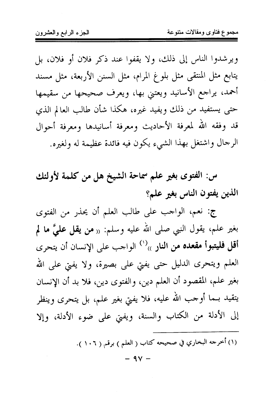 س: الفتوى بغير علم سماحة الشيخ هل من كلمة لأولئك الذين يفتون الناس بغير علم؟