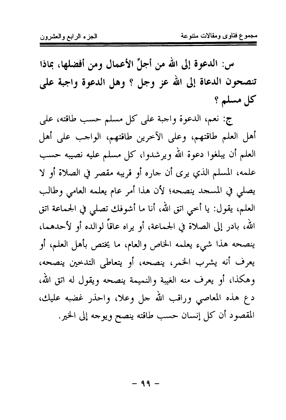 ج: نعم، الدعوة واجبة على كل مسلم حسب طاقته، على أهل العلم طاقتهم، وعلى الآخرين طاقتهم، الواجب على أهل العلم أن يبلغوا دعوة الله ويرشدوا، كل مسلم عليه نصيبه حسب علمه، المسلم الذي يرى أن جاره أو قريبه مقصر في الصلاة أو لا يصلي في المسجد ينصحه؛ لأن هذا أمر عام يعلمه العامي وطالب العلم، يقول: يا أخي اتق الله، أنا ما أشوفك تصلي في الجماعة اتق الله، بادر إلى الصلاة في الجماعة، أو يراه عاقا لوالده أو لأحدهما، ينصحه هذا شيء يعلمه الخاص والعام، ما يختص بأهل العلم، أو يعرف أنه يشرب الخمر، ينصحه، أو يتعاطى التدخين ينصحه، وهكذا، أو يعرف منه الغيبة والنميمة ينصحه ويقول له اتق الله، دع هذه المعاصي وراقب الله جل وعلا، وأحذر غضبه عليك، المقصود أن كل إنسان حسب طاقته ينصح ويوجه إلى الخير.