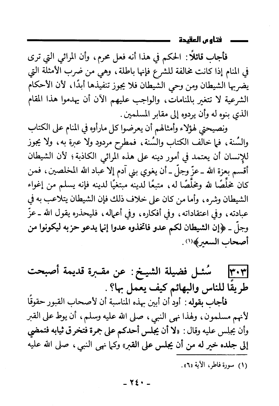 (303) سئل فضيلة الشيخ: عن مقبرة قديمة أصبحت طريقًا للناس والبهائم كيف يعمل بها؟