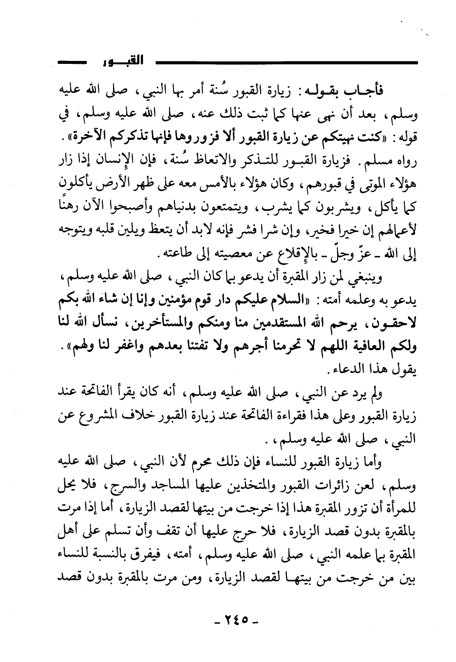 وينبغي لمن زار المقبرة أن يدعو بما كان النبي صَلَّى اللَّهُ عَلَيْهِ وَسَلَّمَ يدعو به وعلمه أمته: «السلام عليكم دار قوم مؤمنين، وإنا إن شاء الله بكم لاحقون، يرحم الله المستقدمين منا ومنكم والمستأخرين، نسأل الله لنا ولكم العافية، اللهم لا تحرمنا أجرهم، ولا تفتنا بعدهم، واغفر لنا ولهم» يقول هذا الدعاء.