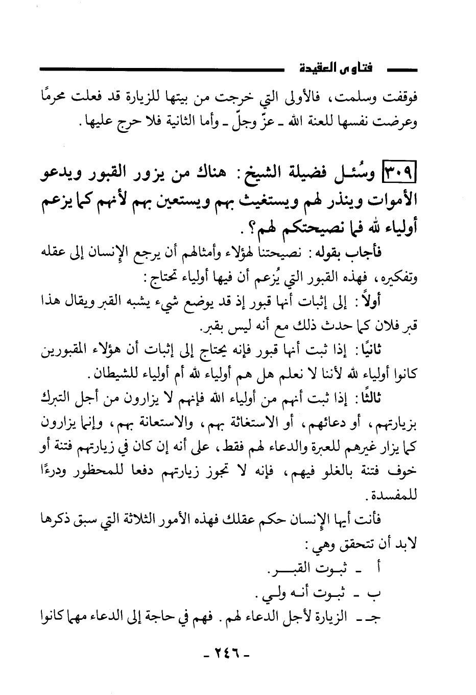 (309) وسئل فضيلة الشيخ: هناك من يزور القبور ويدعو الأموات وينذر لهم ويستغيث بهم ويستعين بهم؛ لأنهم كما يزعم أولياء لله، فما نصيحتكم لهم؟