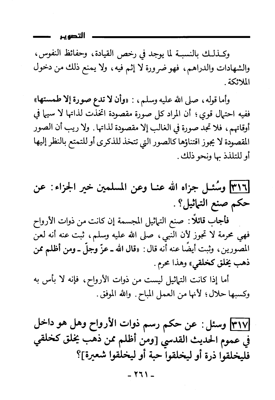 (317) وسئل: عن حكم رسم ذوات الأرواح وهل هو داخل في عموم الحديث القدسي «ومن أظلم ممن ذهب يخلق كخلقي فليخلقوا ذرة أو ليخلقوا حبة أو ليخلقوا شعيرة» ؟