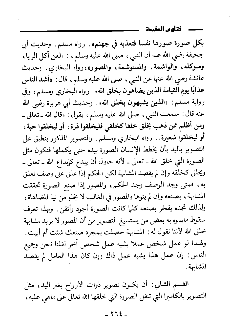 «بكل صورة صورها نفسًا فتعذبه في جهنم» . رواه مسلم. وحديث أبي جحيفة رضي الله عنه أن النبي صَلَّى اللَّهُ عَلَيْهِ وَسَلَّمَ: «لعن آكل الربا وموكله، والواشمة، والمستوشمة، والمصور» رواه البخاري. وحديث عائشة رضي الله عنها عن النبي صَلَّى اللَّهُ عَلَيْهِ وَسَلَّمَ قال: «أشد الناس عذابًا يوم القيامة الذين يضاهون بخلق الله» . رواه البخاري ومسلم، وفي رواية مسلم: «الذين يشبهون بخلق الله» .