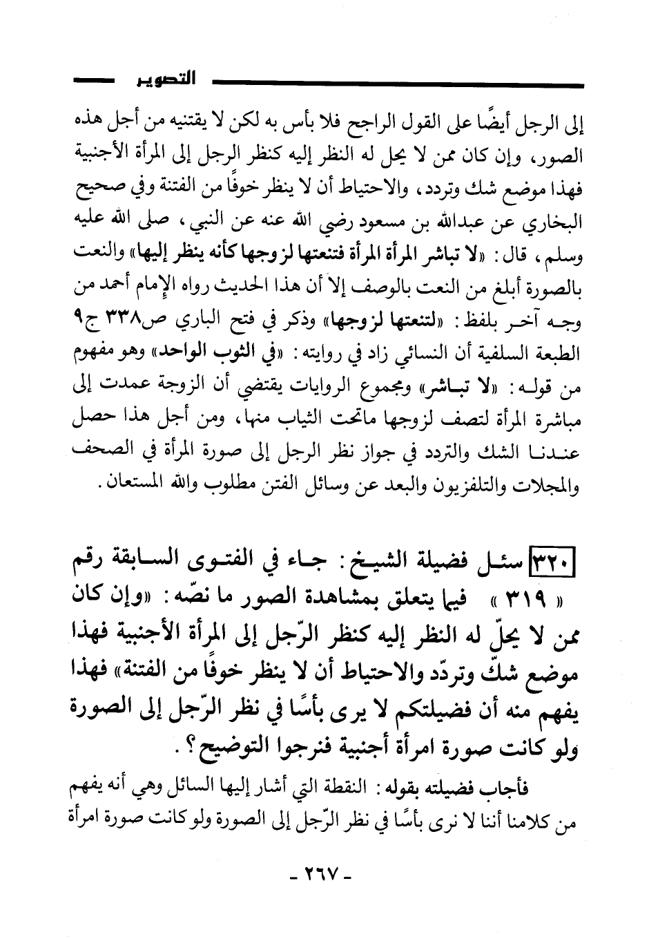 (320) سئل فضيلة الشيخ: جاء في الفتوى السابقة رقم "319" فيما يتعلق بمشاهدة الصور ما نصه: "وإن كان ممن لا يحل له النظر إليه كنظر الرجل إلى المرأة الأجنبية, فهذا موضع شك وتردد, والاحتياط أن لا ينظر خوفًا من الفتنة" فهذا يفهم منه أن فضيلتكم لا يرى بأسًا في نظر الرجل إلى الصورة ولو كانت صورة امرأة أجنبية فنرجو التوضيح؟
