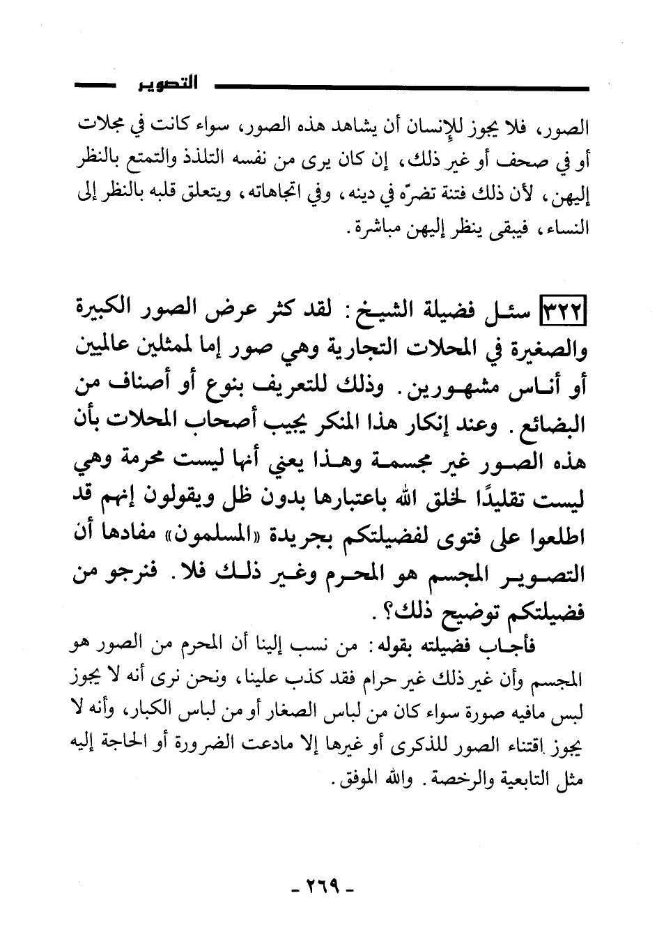 (322) سئل فضيلة الشيخ: لقد كثر عرض الصور الكبيرة والصغيرة في المحلات التجارية وهي صور إما لممثلين عالميين أو أناس مشهورين. وذلك للتعريف بنوع أو أصناف من البضائع. وعند إنكار هذا المنكر يجيب أصحاب المحلات بأن هذه الصور غير مجسمة وهذا يعني أنها ليست محرمة, وهي ليست تقليدًا لخلق الله باعتبارها بدون ظل, ويقولون: إنهم قد اطلعوا على فتوى لفضيلتكم بجريدة "المسلمون" مفادها أن التصوير المجسم هو المحرم وغير ذلك فلا. فنرجو من فضيلتكم توضيح ذلك؟