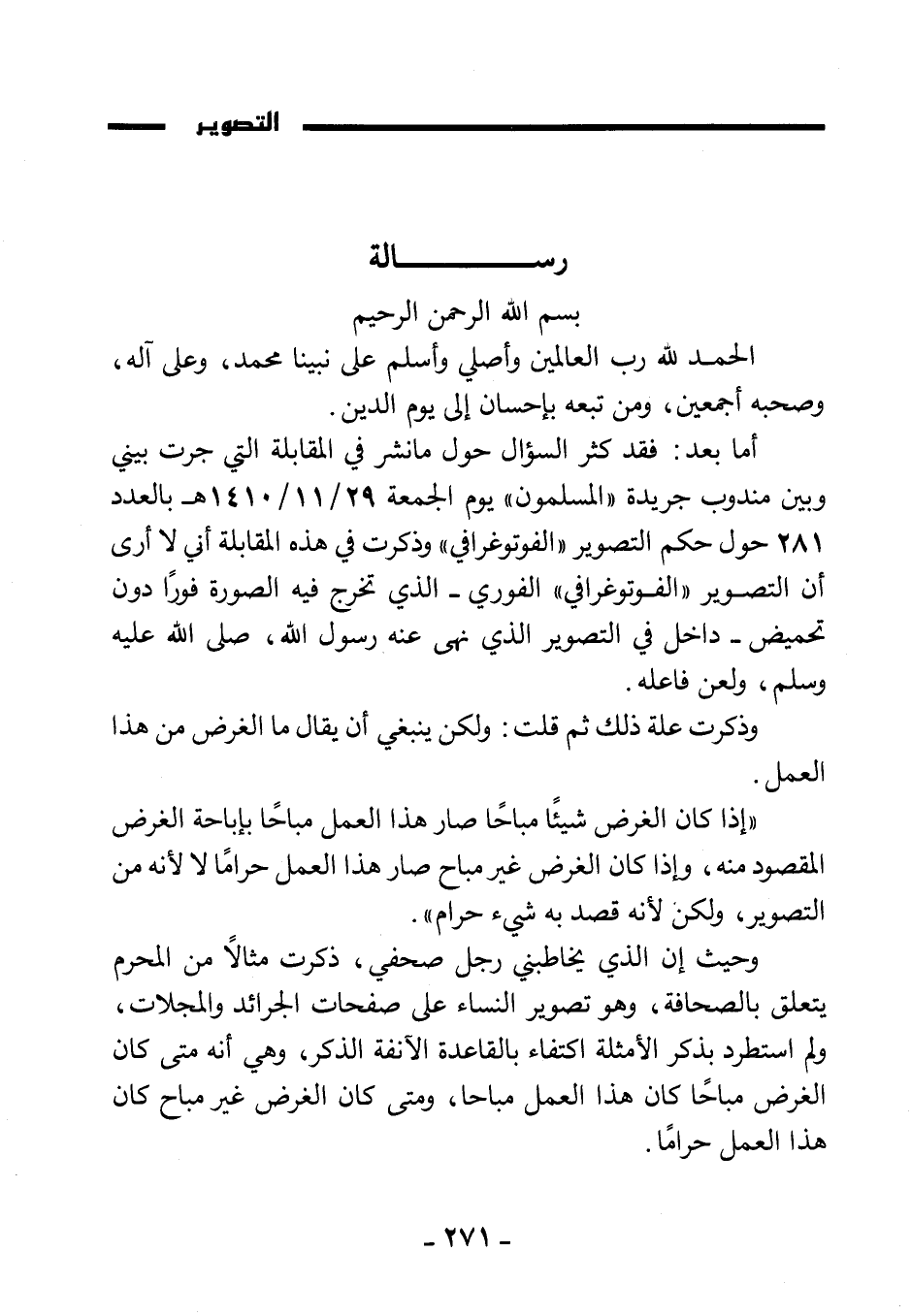 أما بعد: فقد كثر السؤال حول ما نشر في المقابلة التي جرت بيني وبين مندوب جريدة "المسلمون" يوم الجمعة 29\11\1410هـ بالعدد 281 حول حكم التصوير "الفوتوغرافي" وذكرت في هذه المقابلة أني لا أرى أن التصوير "الفوتوغرافي" الفوري -الذي تخرج فيه الصورة فورًا دون تحميض- داخل في التصوير الذي نهى عنه الرسول صلى?الله?عليه?وسلم?، ولعن فاعله.