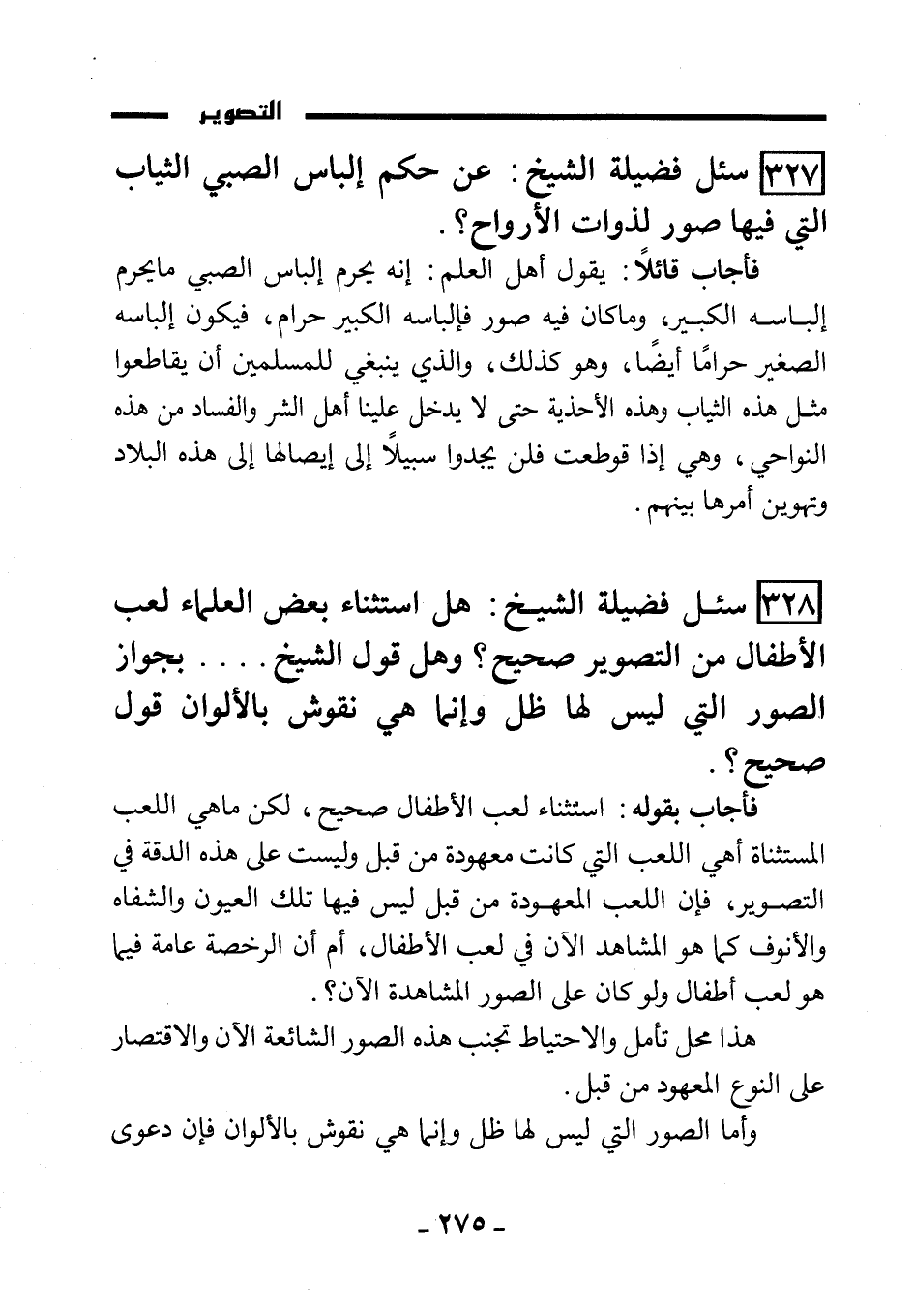 (328) سئل فضيلة الشيخ: هل استثناء بعض العلماء لعب الأطفال من التصويرصحيح؟ وهل قول الشيخ ... بجواز الصور التي ليس لها ظل , وإنما هي نقوش بالألوان قول صحيح؟