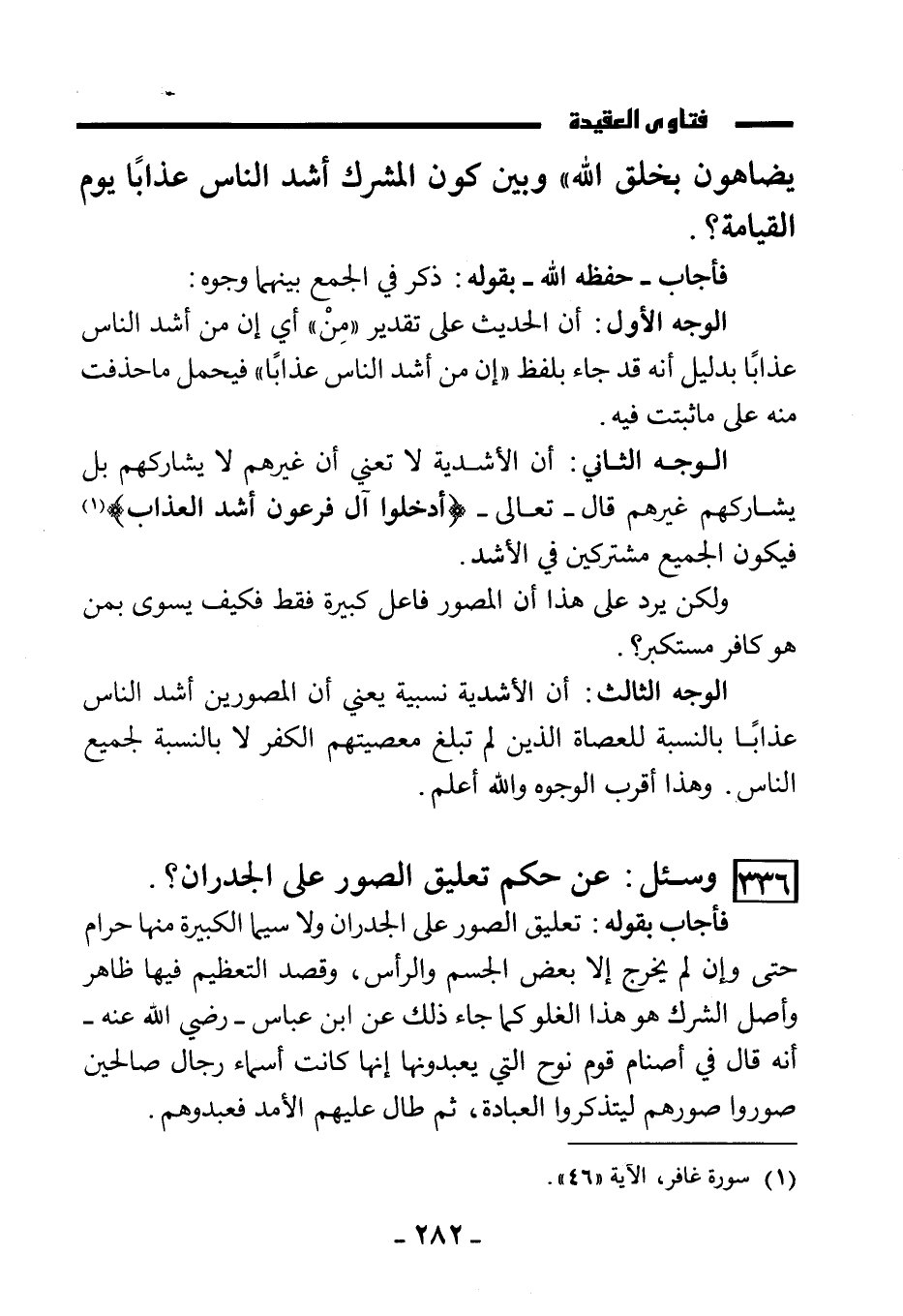 فأجاب بقوله: تعليق الصور على الجدران ولا سيما الكبيرة منها حرام حتى وإن لم يخرج إلا بعض الجسم والرأس، وقصد التعظيم فيها ظاهر, وأصل الشرك هو هذا الغلو كما جاء ذلك عن ابن عباس رضي الله عنه أنه قال في أصنام قوم نوح التي يعبدونها: إنها كانت أسماء رجال صالحين صوروا صورهم ليتذكروا العبادة، ثم طال عليهم الأمد فعبدوهم.