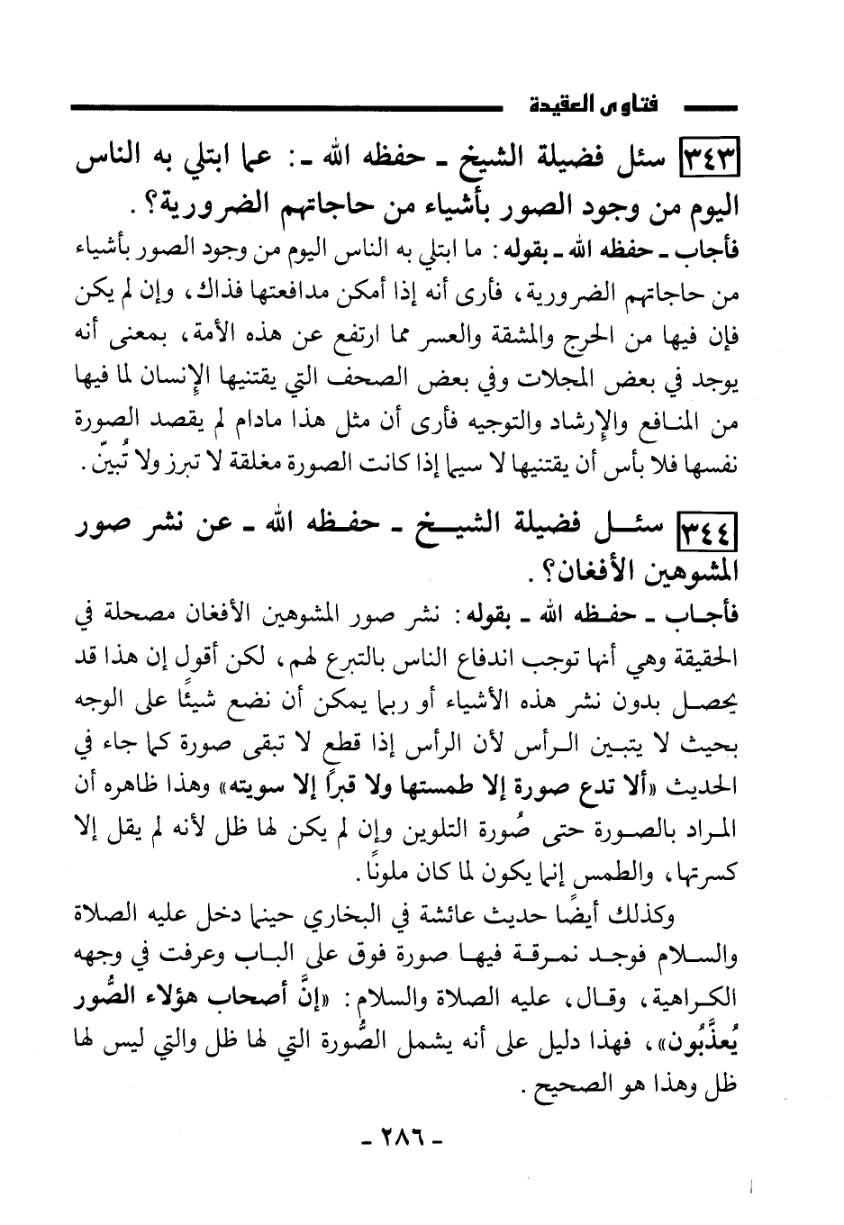 فأجاب -حفظه الله- بقوله: نشر صور المشوهين الأفغان مصلحة في الحقيقة وهي أنها توجب اندفاع الناس بالتبرع لهم، لكن أقول: إن هذا قد يحصل بدون نشر هذه الأشياء أو ربما يمكن أن نضع شيئًا على الوجه بحيث لا يتبين الرأس؛ لأن الرأس إذا قطع لا تبقى صورة كما جاء في الحديث «ألا تدع صورة إلا طمستها ولا قبرًا إلا سويته» وهذا ظاهره أن المراد بالصورة حتى صورة التلوين وإن لم يكن لها ظل؛ لأنه لم يقل: إلا كسرتها، والطمس إنما يكون لما كان ملونًا.