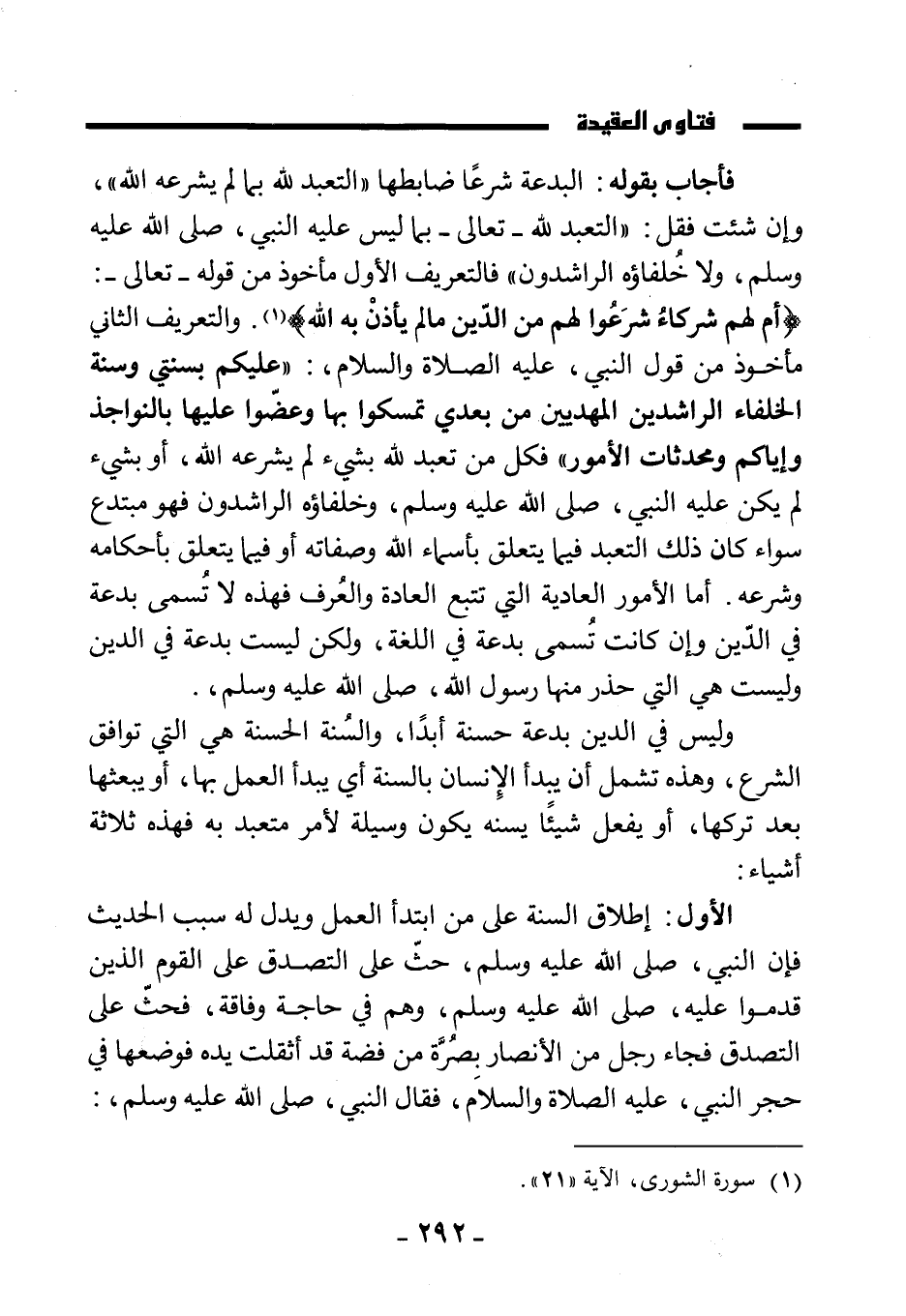 فأجاب بقوله: البدعة شرعًا ضابطها" التعبد لله بما لم يشرعه الله"، وإن شئت فقل: "التعبد لله - تعالى- بما ليس عليه النبي صَلَّى اللَّهُ عَلَيْهِ وَسَلَّمَ ولا خلفاؤه الراشدون" فالتعريف الأول مأخوذ من قوله- تعالى-: {أَمْ لَهُمْ شُرَكَاءُ شَرَعُوا لَهُمْ مِنَ الدِّينِ مَا لَمْ يَأْذَنْ بِهِ اللَّهُ} . والتعريف الثاني مأخوذ من قول النبي عليه الصلاة والسلام: «عليكم بسنتي وسنة الخلفاء الراشدين المهديين من بعدي تمسكوا بها وعضوا عليها بالنواجذ وإياكم ومحدثات الأمور» فكل من تعبد لله بشيء لم يشرعه الله، أو بشيء لم يكن عليه النبي صَلَّى اللَّهُ عَلَيْهِ وَسَلَّمَ، وخلفاؤه الراشدون فهو مبتدع سواء كان ذلك التعبد فيما يتعلق بأسماء الله وصفاته أو فيما يتعلق بأحكامه وشرعه. أما الأمور العادية التي تتبع العادة والعرف فهذه لا تسمى بدعة في الدين وإن كانت تسمى بدعة في اللغة، ولكن ليست بدعة في الدين وليست هي التي حذر منها رسول الله صَلَّى اللَّهُ عَلَيْهِ وَسَلَّمَ.
