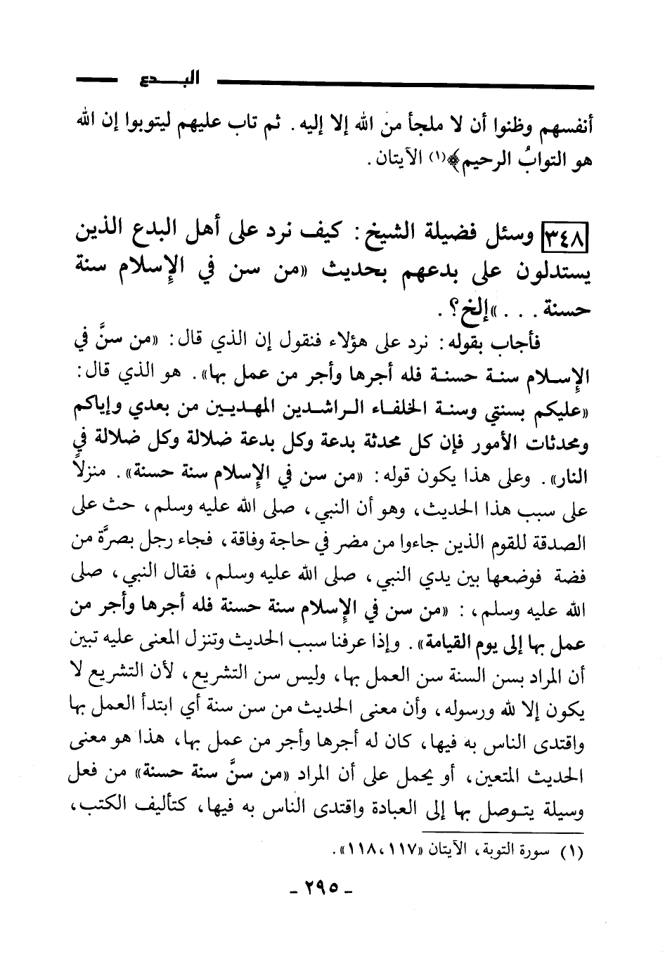 فأجاب بقوله: نرد على هؤلاء فنقول: إن الذي قال: «من سن في الإسلام سنة حسنة فله أجرها وأجر من عمل بها» . هو الذي قال: «عليكم بسنتي وسنة الخلفاء الراشدين المهديين من بعدي وإياكم ومحدثات الأمور فإن كل محدثة بدعة وكل بدعة ضلالة وكل ضلالة في النار» . وعلى هذا يكون قوله: «من سن في الإسلام سنة حسنة» . منزلًا على سبب هذا الحديث، وهو أن النبي -صَلَّى اللَّهُ عَلَيْهِ وَسَلَّمَ- حث على الصدقة للقوم الذين جاءوا من مضر في حاجة وفاقة فجاء رجل بصرة من فضة فوضعها بين يدي النبي -صَلَّى اللَّهُ عَلَيْهِ وَسَلَّمَ-، فقال النبي -صَلَّى اللَّهُ عَلَيْهِ وَسَلَّمَ-: «من سن في الإسلام سنة حسنة فله أجرها وأجر من عمل بها إلى يوم القيامة» . وإذا عرفنا سبب الحديث وتنزل المعنى عليه؛ تبين أن المراد بسن السنة سن العمل بها، وليس سن التشريع لأن التشريع لا يكون إلا لله ورسوله، وأن معنى الحديث من سن سنة أي ابتدأ العمل بها واقتدى الناس به فيها، كان له أجرها وأجر من عمل بها، هذا هو معنى الحديث المتعين، أو يحمل على أن المراد «من سن سنة حسنة» من فعل وسيلة يتوصل بها إلى العبادة واقتدى الناس به فيها، كتأليف الكتاب،