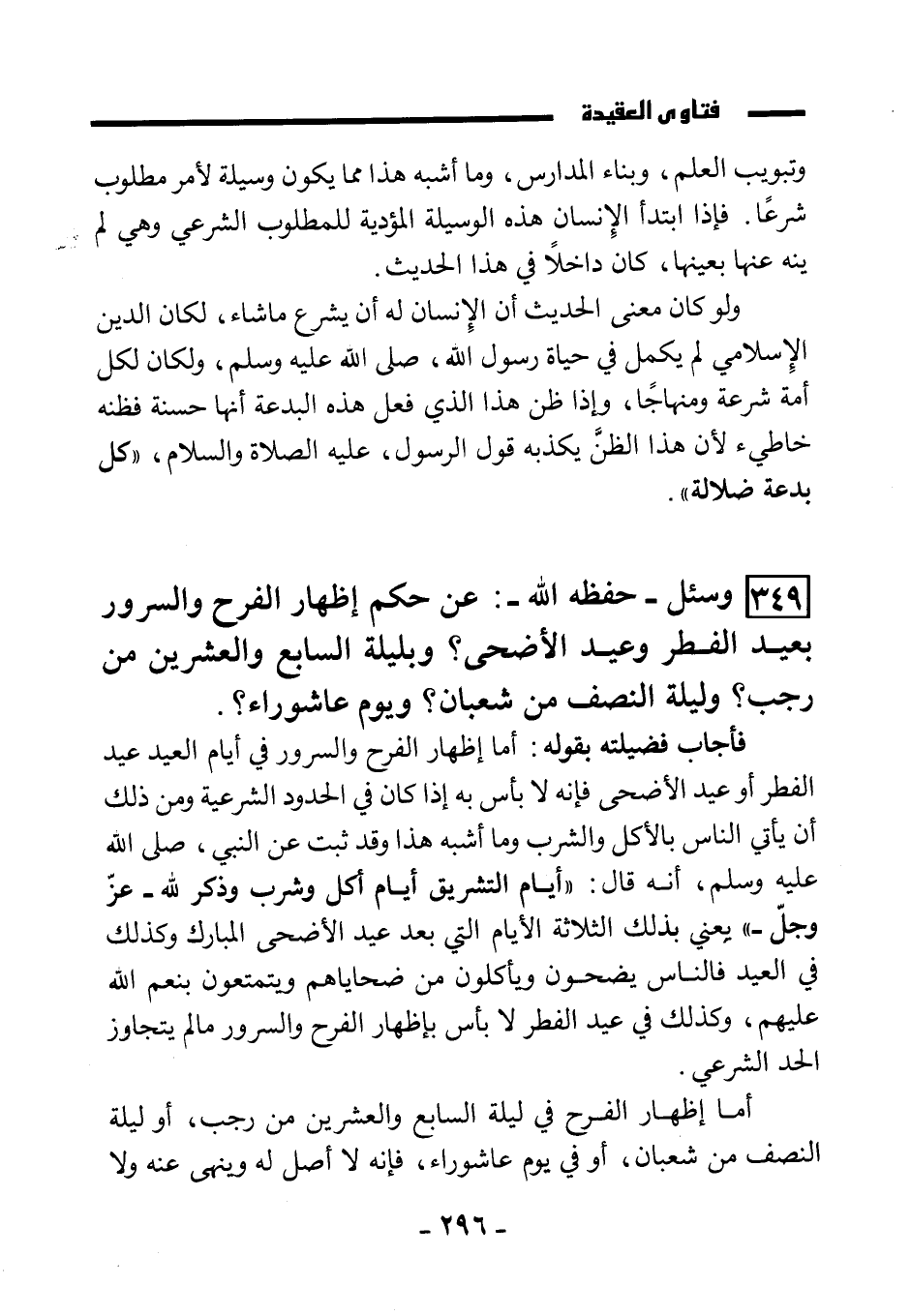 (349) وسئل - حفظه الله-: عن حكم إظهار الفرح والسرور بعيد الفطر وعيد الأضحى؟ وبليلة السابعة والعشرين من رجب؟ وليلة النصف من شعبان؟ ويوم عاشوراء؟