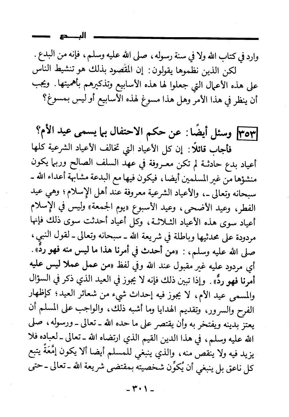 فأجاب قائلًا: إن كل الأعياد التي تخالف الأعياد الشرعية كلها أعياد بدع حادثة لم تكن معروفة في عهد السلف الصالح، وربما يكون منشئها من غير المسلمين أيضًا، فيكون فيها مع البدعة مشابهة أعداء الله -سبحانه وتعالى-، والأعياد الشرعية معروفة عند أهل الإسلام؛ وهي عيد الفطر، وعيد الأضحى، وعيد الأسبوع "يوم الجمعة" وليس في الإسلام أعياد سوى هذه الأعياد الثلاثة، وكل أعياد أحدثت سوى ذلك فإنها مردودة على محدثيها وباطلة في شريعة الله -سبحانه وتعالى- لقول النبي -صَلَّى اللَّهُ عَلَيْهِ وَسَلَّمَ-: «من أحدث في أمرنا هذا ما ليس منه فهو رد» . أي مردود عليه غير مقبول عند الله وفي لفظ " «من عمل عملًا ليس عليه أمرنا فهو رد» . وإذا تبين ذلك فإنه لا يجوز في العيد الذي ذكر في السؤال والمسمى عيد الأم، لا يجوز فيه إحداث شيء من شعائر العيد؛ كإظهار الفرح والسرور وتقديم الهدايا وما أشبه ذلك، والواجب على المسلم أن يعتز بدينه ويفتخر به وأن يقتصر على ما حده الله - تعالى- ورسوله -صَلَّى اللَّهُ عَلَيْهِ وَسَلَّمَ- في هذا الدين القيم الذي ارتضاه الله -تعالى- لعباده فلا يزيد فيه ولا ينقص منه، والذي ينبغي للمسلم أيضًا ألا يكون إمعة يتبع كل ناعق بل ينبغي أن يكون شخصيته بمقتضى شريعة الله - تعالى- حتى