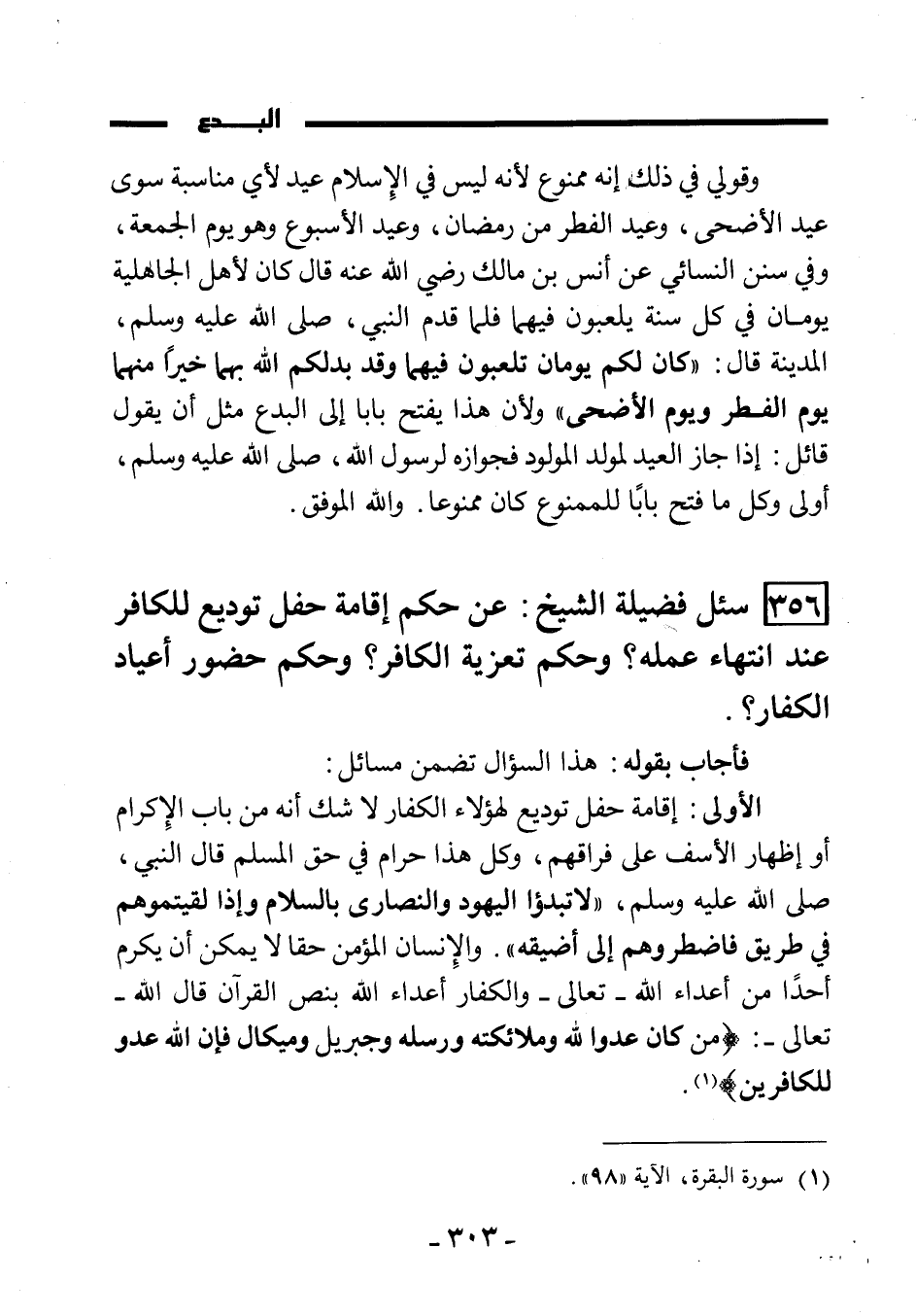 (356) سئل فضيلة الشيخ: عن حكم إقامة حفل توديع للكافر عند انتهاء عمله؟ وحكم تعزية الكافر؟ وحكم حضور أعياد الكفار؟