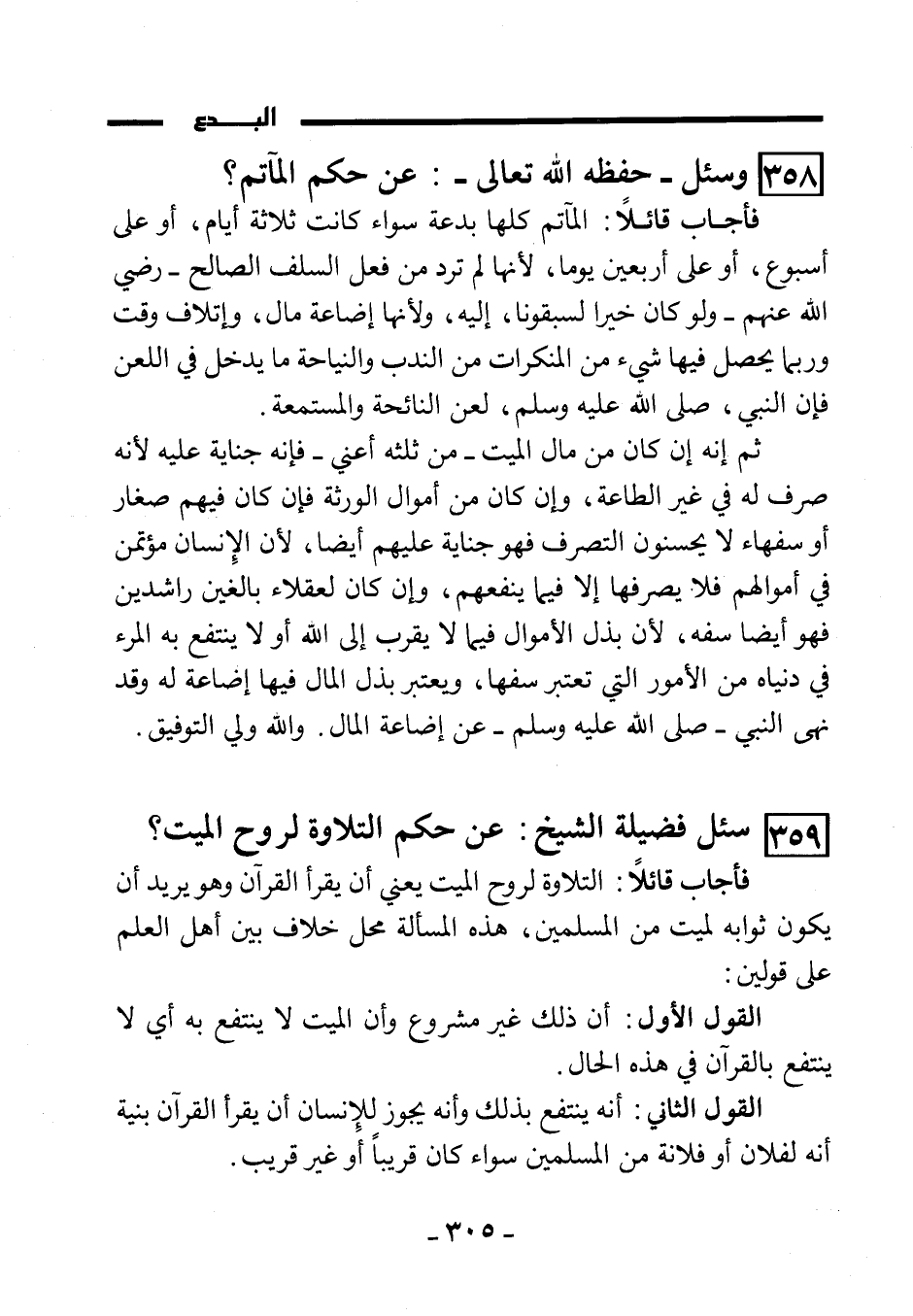 فأجاب قائلًا: المآتم كلها بدعة سواء كانت ثلاثة أيام، أو على أسبوع، أو على أربعين يومًا، لأنها لم ترد من فعل السلف الصالح -رضي الله عنهم- ولو كان خيرًا لسبقونا إليه، ولأنها إضاعة مال، وإتلاف وقت وربما يحصل فيها شيء من المنكرات من الندب والنياحة ما يدخل في اللعن؛ فإن النبي -صَلَّى اللَّهُ عَلَيْهِ وَسَلَّمَ- لعن النائحة والمستمعة.