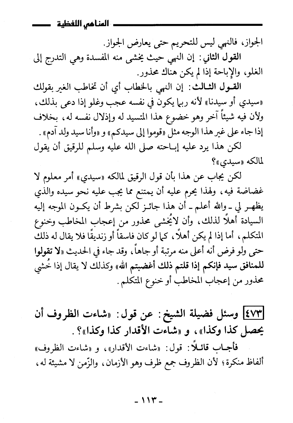 لكن يجاب عن هذا بأن قول الرقيق لمالكه: " سيدي " أمر معلوم لا غضاضة فيه، ولهذا يحرم عليه أن يمتنع مما يجب عليه نحو سيده والذي يظهر لي - والله أعلم - أن هذا جائز لكن بشرط أن يكون الموجه إليه السيادة أهلًا لذلك، وأن لا يخشى محذور من إعجاب المخاطب وخنوع المتكلم، أما إذا لم يكن أهلًا، كما لو كان فاسقًا أو زنديقًا فلا يقال له ذلك حتى ولو فرض أنه أعلى منه مرتبة أو جاهًا، وقد جاء في الحديث: «لا تقولوا للمنافق: سيد فإنكم إذا قلتم ذلك أغضبتم الله» وكذلك لا يقال إذا خشي محذور من إعجاب المخاطب أو خنوع المتكلم.