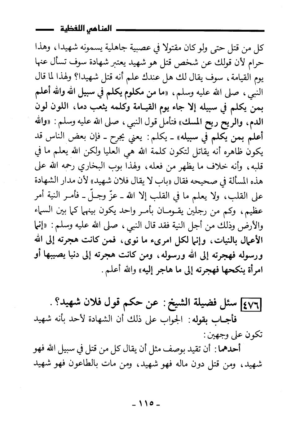كل من قتل حتى ولو كان مقتولًا في عصبية جاهلية يسمونه شهيدًا، وهذا حرام لأن قولك عن شخص قتل: هو شهيد يعتبر شهادة سوف تسأل عنها يوم القيامة، سوف يقال لك: هل عندك علم أنه قتل شهيدًا؟ ولهذا لما قال النبي، صَلَّى اللَّهُ عَلَيْهِ وَسَلَّمَ: «ما من مكلوم يكلم في سبيل الله والله أعلم بمن يكلم في سبيله إلا جاء يوم القيامة وكلمه يثعب دمًا، اللون لون الدم، والريح ريح المسك» فتأمل قول النبي، صَلَّى اللَّهُ عَلَيْهِ وَسَلَّمَ: «والله أعلم بمن يكلم في سبيله» - يكلم: يعني يجرح - فإن بعض الناس قد يكون ظاهره أنه يقاتل لتكون كلمة الله هي العليا ولكن الله يعلم ما في قلبه، وأنه خلاف ما يظهر من فعله، ولهذا بوب البخاري رحمه الله على هذه المسألة في صحيحه فقال: " باب لا يقال: فلان شهيد " لأن مدار الشهادة على القلب، ولا يعلم ما في القلب إلا الله - عز وجل - فأمر النية أمر عظيم، وكم من رجلين يقومان بأمر واحد يكون بينهما كما بين السماء والأرض وذلك من أجل النية فقد قال النبي، صَلَّى اللَّهُ عَلَيْهِ وَسَلَّمَ: «إنما الأعمال بالنيات، وإنما لكل امرئ ما نوى، فمن كانت هجرته إلى الله ورسوله فهجرته إلى الله ورسوله، ومن كانت هجرته إلى دنيا يصيبها أو امرأة ينكحها فهجرته إلى ما هاجر إليه» والله أعلم.