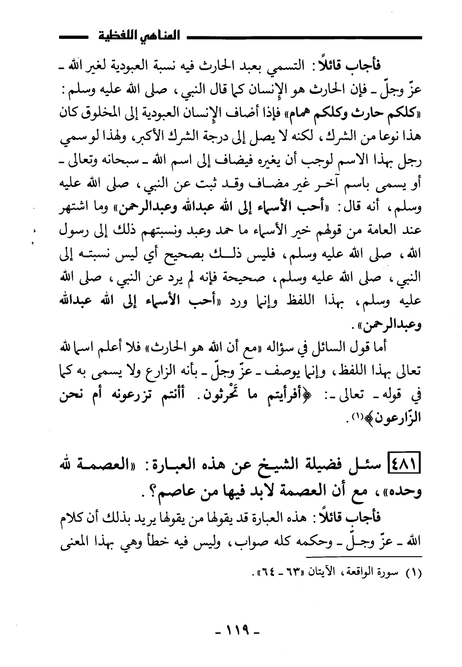 فأجاب قائلًا: التسمي بعبد الحارث فيه نسبة العبودية لغير الله - عز وجل - فإن الحارث هو الإنسان كما قال النبي، صَلَّى اللَّهُ عَلَيْهِ وَسَلَّمَ: «كلكم حارث وكلكم همام» فإذا أضاف الإنسان العبودية إلى المخلوق كان هذا نوعًا من الشرك، لكنه لا يصل إلى درجة الشرك الأكبر، ولهذا لو سمي رجل بهذا الاسم لوجب أن يغيره فيضاف إلى اسم الله - سبحانه وتعالى - أو يسمى باسم آخر غير مضاف وقد ثبت عن النبي، صَلَّى اللَّهُ عَلَيْهِ وَسَلَّمَ، أنه قال: «أحب الأسماء إلى الله عبد الله وعبد الرحمن» وما اشتهر عند العامة من قولهم: خير الأسماء ما حمد وعبد ونسبتهم ذلك إلى رسول الله، صَلَّى اللَّهُ عَلَيْهِ وَسَلَّمَ، فليس ذلك بصحيح أي ليس نسبته إلى النبي، صَلَّى اللَّهُ عَلَيْهِ وَسَلَّمَ، صحيحة فإنه لم يرد عن النبي، صَلَّى اللَّهُ عَلَيْهِ وَسَلَّمَ، بهذا اللفظ وإنما ورد «أحب الأسماء إلى الله عبد الله وعبد الرحمن» .