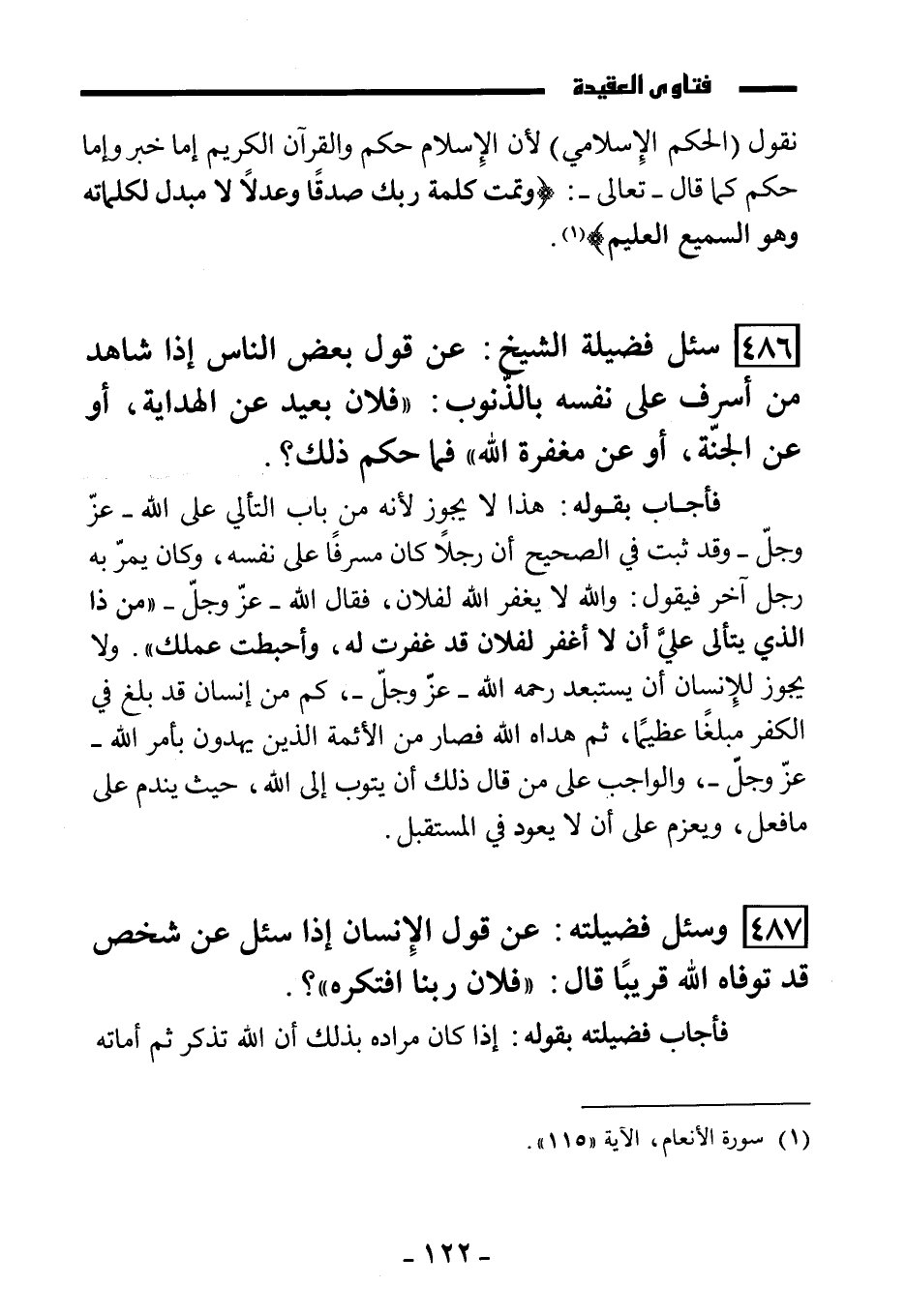 (486) سئل فضيلة الشيخ: عن قول بعض الناس إذا شاهد من أسرف على نفسه بالذنوب: " فلان بعيد عن الهداية، أو عن الجنة، أو عن مغفرة الله " فما حكم ذلك؟ .