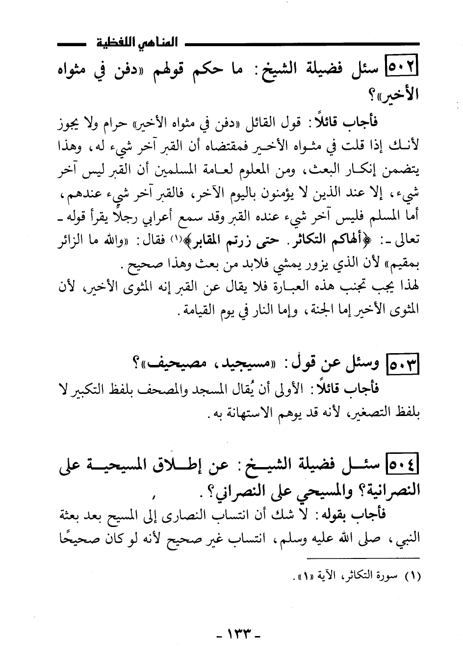 فأجاب قائلًا: قول القائل: " دفن في مثواه الأخير " حرام ولا يجوز لأنك إذا قلت: في مثواه الأخير فمقتضاه أن القبر آخر شيء له، وهذا يتضمن إنكار البعث، ومن المعلوم لعامة المسلمين أن القبر ليس آخر شيء، إلا عند الذين لا يؤمنون باليوم الآخر، فالقبر آخر شيء عندهم، أما المسلم فليس آخر شيء عنده القبر وقد سمع أعرابي رجلًا يقرأ قوله تعالى: {أَلْهَاكُمُ التَّكَاثُرُ حَتَّى زُرْتُمُ الْمَقَابِرَ} فقال: " والله ما الزائر بمقيم " لأن الذي يزور يمشي فلا بد من بعث وهذا صحيح.