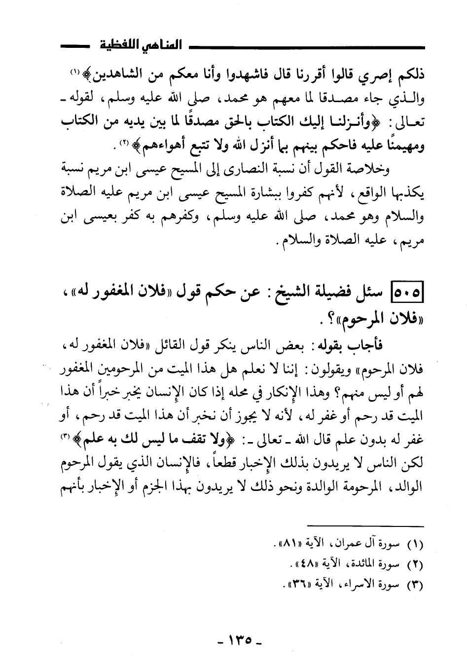 فأجاب بقوله: بعض الناس ينكر قول القائل: "فلان المغفور له، فلان المرحوم" ويقولون: إننا لا نعلم هل هذا الميت من المرحومين المغفور لهم أو ليس منهم؟ وهذا الإنكار في محله إذا كان الإنسان يخبر خبراً أن هذا الميت قد رحم أو غفر له، لأنه لا يجوز أن نخبر أن هذا الميت قد رحم، أو غفر له بدون علم قال الله تعالى: {ولا تقف ما ليس لك به علم} لكن الناس لا يريدون بذلك الإخبار قطعاً، فالإنسان الذي يقول: المرحوم الوالد، المرحومة الوالدة ونحو ذلك لا يريد بهذا الجزم أو الإخبار بأنهم