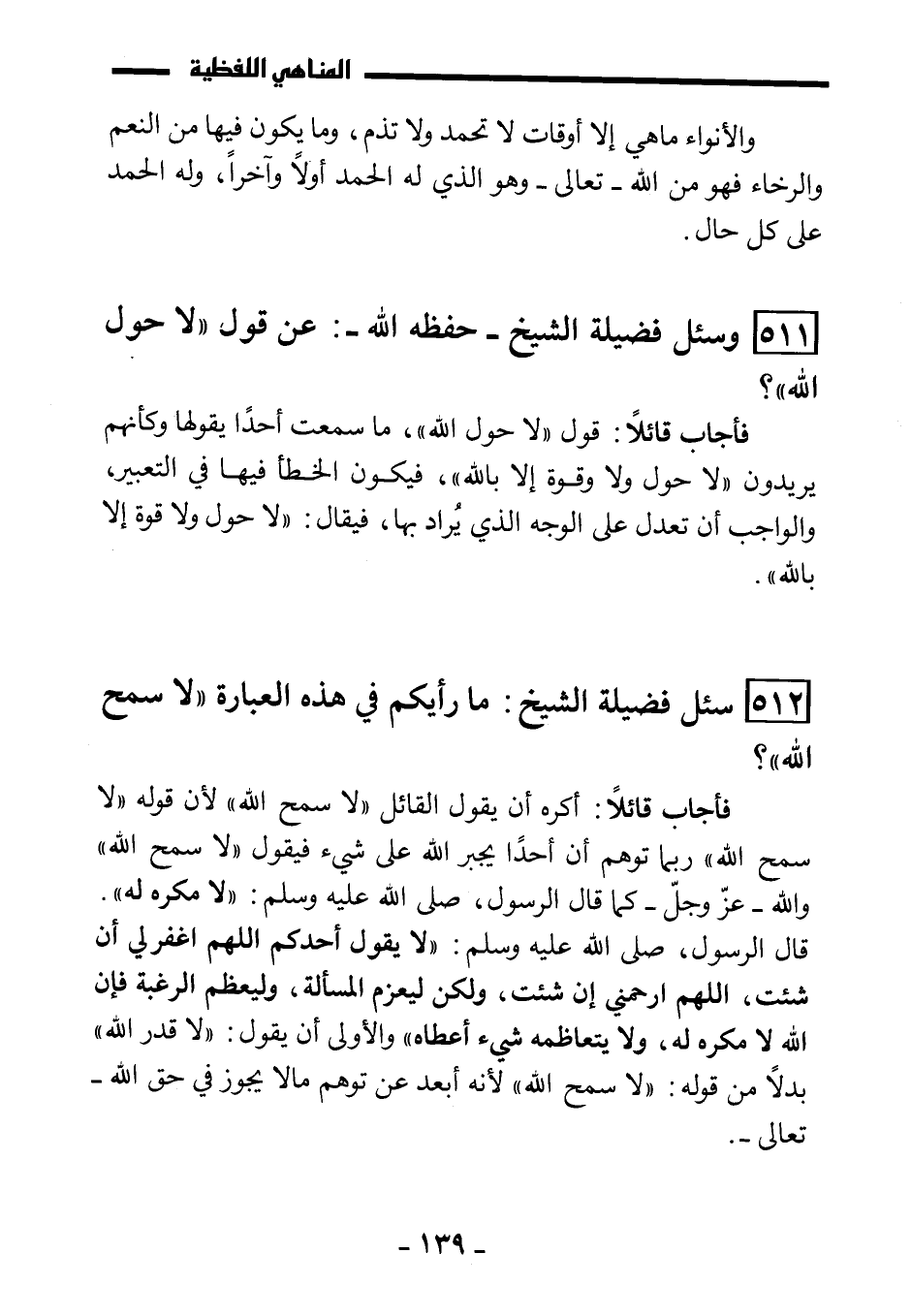 (511) وسئل فضيلة الشيخ - حفظه الله -: عن قول: " لا حول الله "