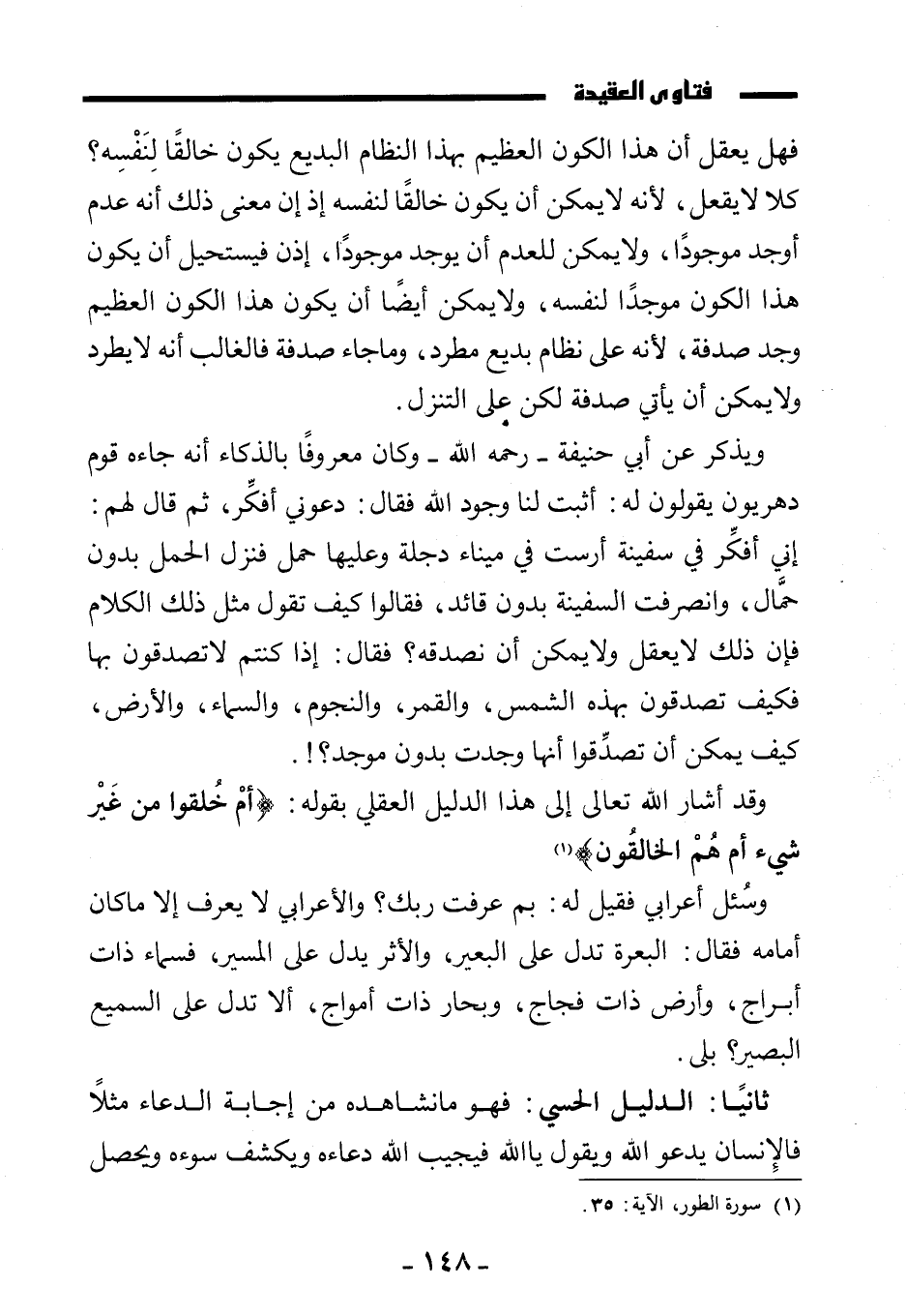ويذكر عن أبي حنيفة - رحمه الله - وكان معروفًا بالذكاء أنه جاءه قوم دهريون يقولون له: أثبت لنا وجود الله فقال: دعوني أفكر، ثم قال لهم: إني أفكر في سفينة أرست في ميناء دجلة وعليها حمل فنزل الحمل بدون حمال، وانصرفت السفينة بدون قائد، فقالوا: كيف تقول مثل ذلك الكلام فإن ذلك لا يعقل ولا يمكن أن نصدقه؟ فقال: إذا كنتم لا تصدقون بها فكيف تصدقون بهذه الشمس، والقمر، والنجوم، والسماء، والأرض، كيف يمكن أن تصدقوا أنها وجدت بدون موجد؟ !
