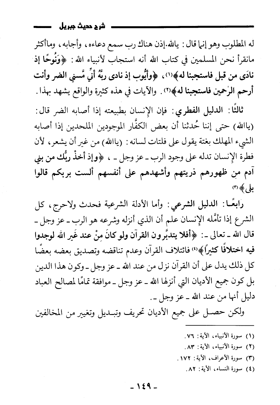 رابعًا: الدليل الشرعي: وأما الأدلة الشرعية فحدث ولا حرج، كل الشرع إذا تأمله الإنسان علم أن الذي أنزله وشرعه هو الرب - عز وجل - قال الله تعالى: {أَفَلَا يَتَدَبَّرُونَ الْقُرْآنَ وَلَوْ كَانَ مِنْ عِنْدِ غَيْرِ اللَّهِ لَوَجَدُوا فِيهِ اخْتِلَافًا كَثِيرًا} فائتلاف القرآن وعدم تناقضه وتصديق بعضه بعضًا كل ذلك يدل على أن القرآن نزل من عند الله - عز وجل - وكون هذا الدين بل كون جميع الأديان التي أنزلها الله - عز وجل - موافقة تمامًا لمصالح العباد دليل أنها من عند الله - عز وجل -.
