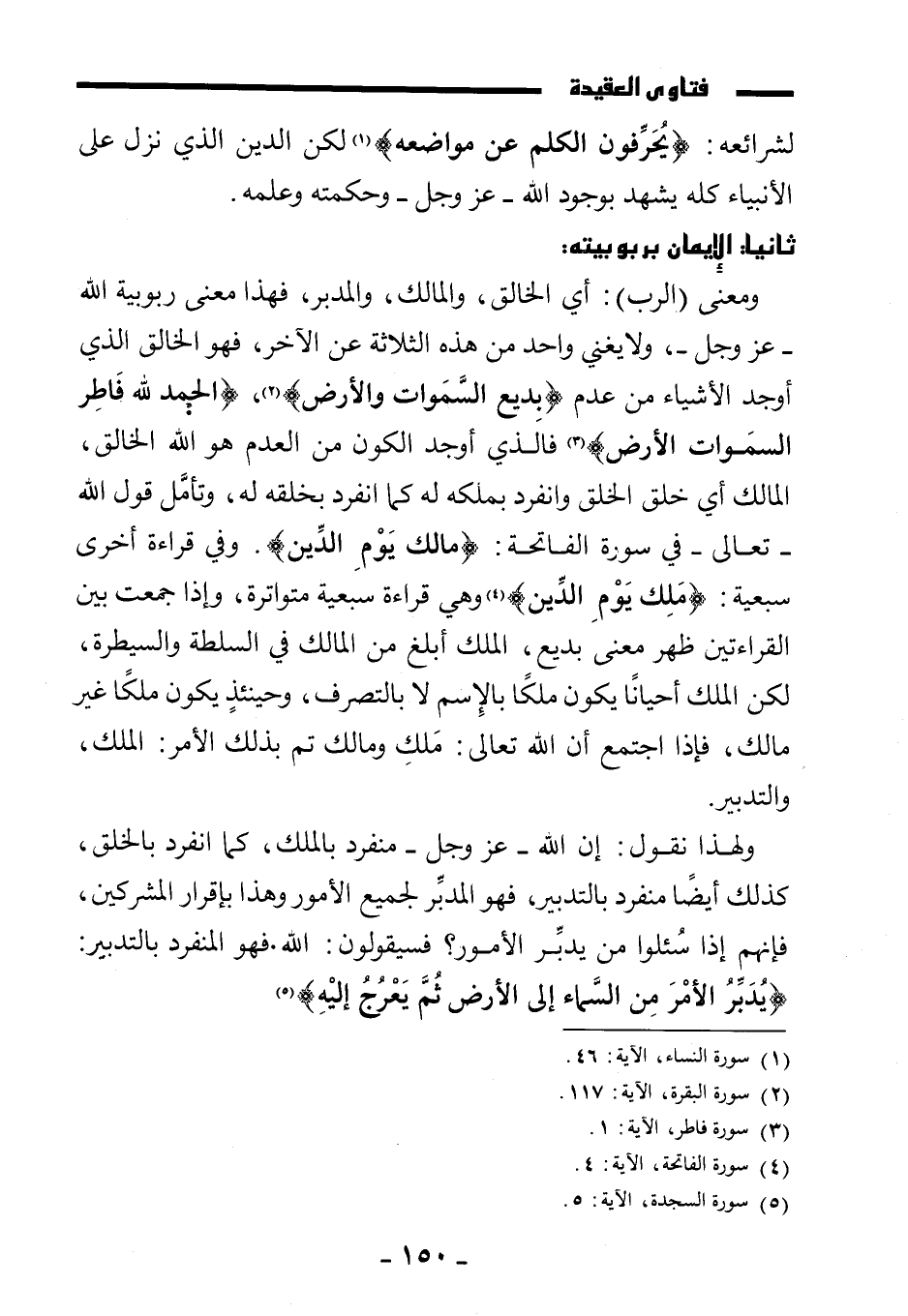 ولهذا نقول: إن الله - عز وجل - منفرد بالملك، كما انفرد بالخلق، كذلك أيضًا منفرد بالتدبير، فهو المدبر لجميع الأمور وهذا بإقرار المشركين، فإنهم إذا سئلوا من يدبر الأمور؟ فسيقولون: الله. فهو المنفرد بالتدبير: {يُدَبِّرُ الْأَمْرَ مِنَ السَّمَاءِ إِلَى الْأَرْضِ ثُمَّ يَعْرُجُ إِلَيْهِ} .