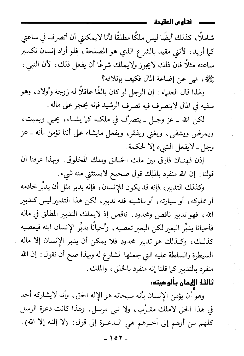 وكذلك التدبير، فإنه قد يكون للإنسان، فإنه يدبر مثل أن يدبر خادمه أو مملوكه، أو سيارته، أو ماشيته فله تدبير، لكن هذا التدبير ليس كتدبير الله، فهو تدبير ناقص ومحدود. ناقص إذ لا يملك التدبير المطلق في ماله فأحيانًا يدبر البعير لكن البعير تعصيه، وأحيانًا يدبر الإنسان ابنه فيعصيه كذلك، وكذلك هو تدبير محدود فلا يمكن أن يدبر الإنسان إلا ما له السيطرة والسلطة عليه التي جعلها الشارع له وبهذا صح أن نقول: إن الله منفرد بالتدبير كما قلنا: إنه منفرد بالخلق، والملك.