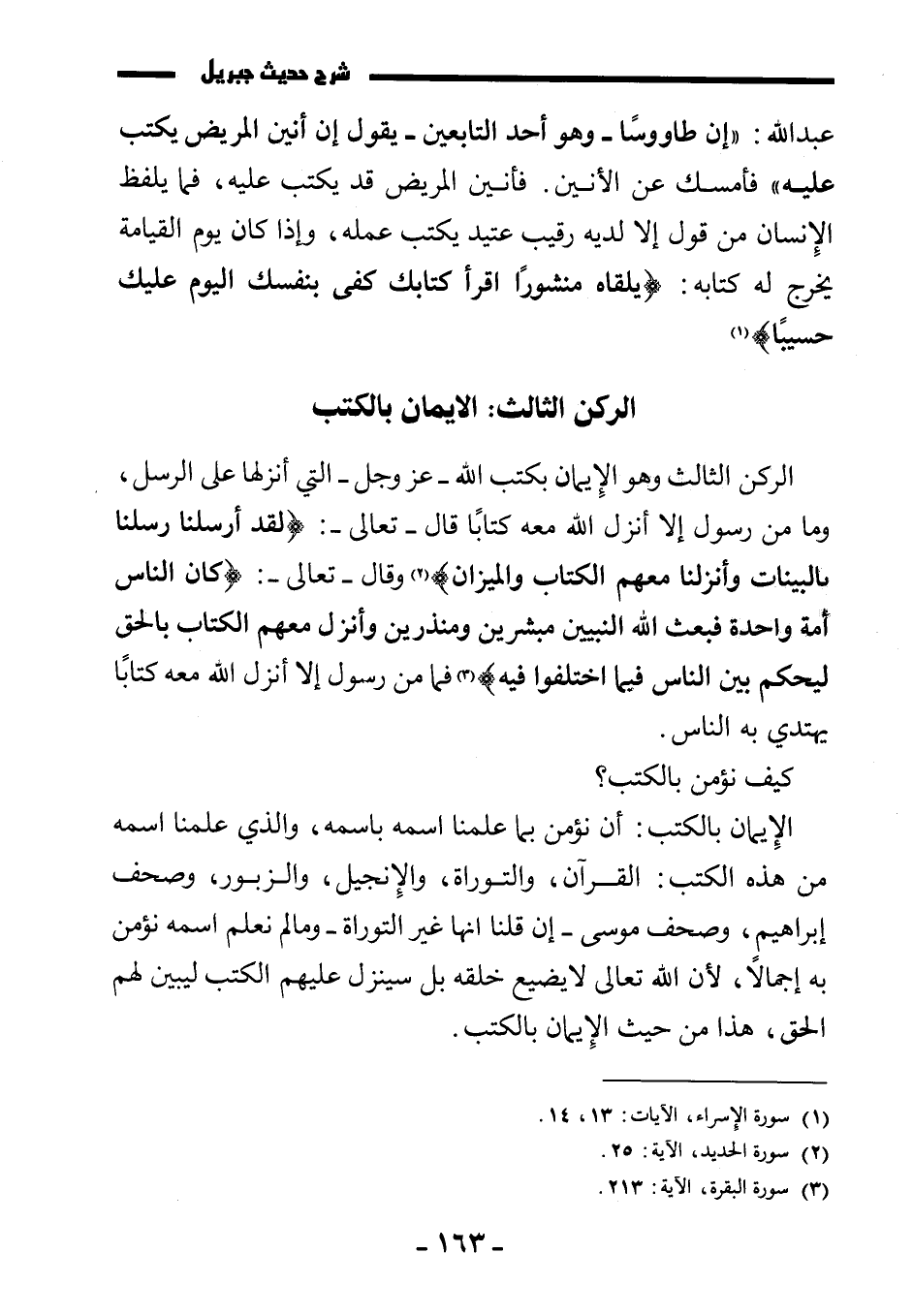 الركن الثالث وهو الإيمان بكتب الله - عز وجل - التي أنزلها على الرسل، وما من رسول إلا أنزل الله معه كتابًا قال تعالى: {لَقَدْ أَرْسَلْنَا رُسُلَنَا بِالْبَيِّنَاتِ وَأَنْزَلْنَا مَعَهُمُ الْكِتَابَ وَالْمِيزَانَ} وقال تعالى: {كَانَ النَّاسُ أُمَّةً وَاحِدَةً فَبَعَثَ اللَّهُ النَّبِيِّينَ مُبَشِّرِينَ وَمُنْذِرِينَ وَأَنْزَلَ مَعَهُمُ الْكِتَابَ بِالْحَقِّ لِيَحْكُمَ بَيْنَ النَّاسِ فِيمَا اخْتَلَفُوا فِيهِ} فما من رسول إلا أنزل الله معه كتابًا يهتدي به الناس.