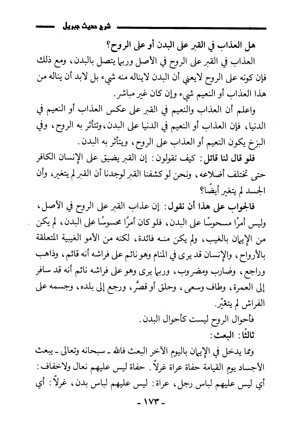 ومما يدخل في الإيمان باليوم الآخر البعث فالله - سبحانه وتعالى - يبعث الأجساد يوم القيامة حفاة عراة غرلًا. حفاة ليس عليهم نعال ولا خفاف: أي ليس عليهم لباس رجل، عراة: ليس عليهم لباس بدن، غرلًا: أي