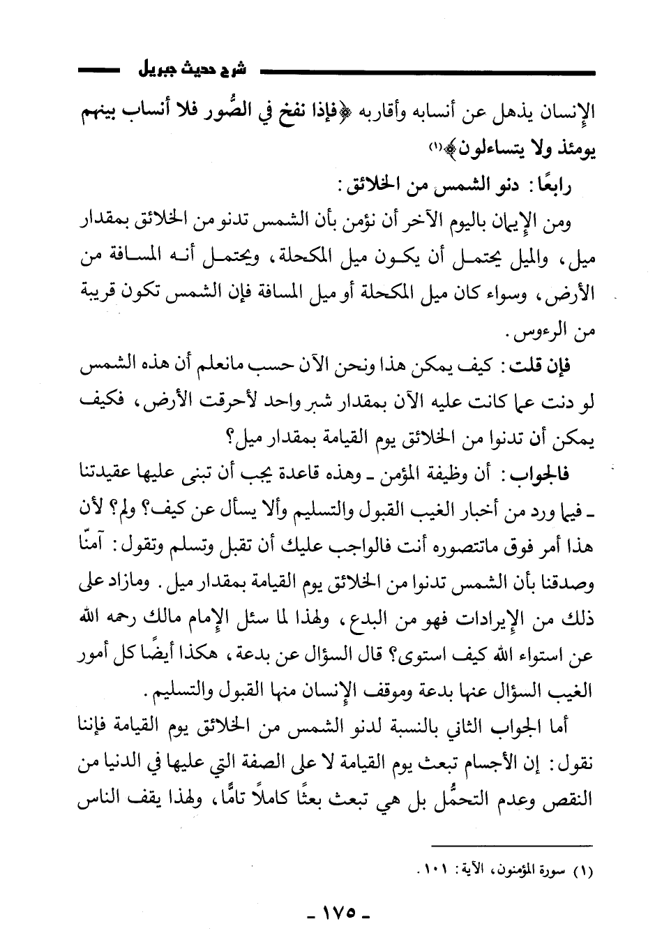 ومن الإيمان باليوم الآخر أن نؤمن بأن الشمس تدنو من الخلائق بمقدار ميل، والميل يحتمل أن يكون ميل المكحلة، ويحتمل أنه المسافة من الأرض، وسواء كان ميل المكحلة أو ميل المسافة فإن الشمس تكون قريبة من الرءوس.