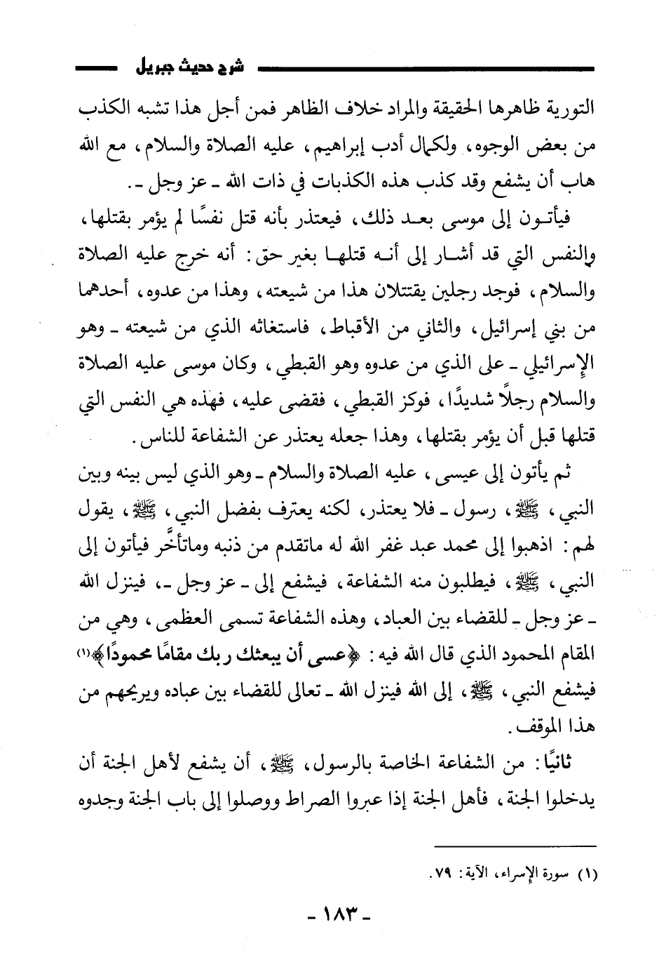 فيأتون إلى موسى بعد ذلك، فيعتذر بأنه قتل نفسًا لم يؤمر بقتلها، والنفس التي قد أشار إلى أنه قتلها بغير حق: أنه خرج عليه الصلاة والسلام، فوجد رجلين يقتتلان هذا من شيعته، وهذا من عدوه، أحدهما من بني إسرائيل، والثاني من الأقباط، فاستغاثه الذي من شيعته - وهو الإسرائيلي - على الذي من عدوه وهو القبطي، وكان موسى عليه الصلاة والسلام رجلًا شديدًا، فوكز القبطي، فقضى عليه، فهذه هي النفس التي قتلها قبل أن يؤمر بقتلها، وهذا جعله يعتذر عن الشفاعة للناس.