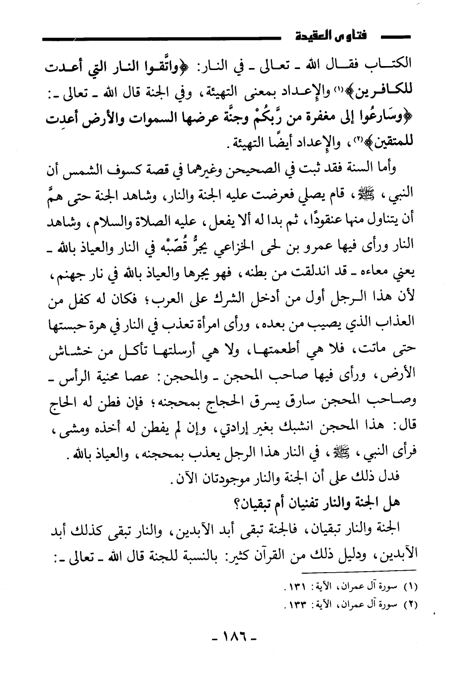 الكتاب فقال الله تعالى في النار: {وَاتَّقُوا النَّارَ الَّتِي أُعِدَّتْ لِلْكَافِرِينَ} والإعداد بمعنى التهيئة، وفي الجنة قال الله تعالى: {وَسَارِعُوا إِلَى مَغْفِرَةٍ مِنْ رَبِّكُمْ وَجَنَّةٍ عَرْضُهَا السَّمَاوَاتُ وَالْأَرْضُ أُعِدَّتْ لِلْمُتَّقِينَ} ، والإعداد أيضًا التهيئة.