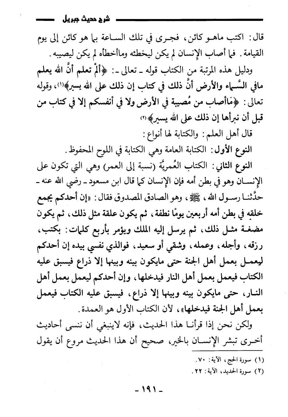 النوع الثاني: الكتابة العمرية (نسبة إلى العمر) وهي التي تكون على الإنسان وهو في بطن أمه فإن الإنسان كما قال ابن مسعود - رضي الله عنه -: حدثنا رسول الله، صَلَّى اللَّهُ عَلَيْهِ وَسَلَّمَ، وهو الصادق المصدوق فقال: «إن أحدكم يجمع خلقه في بطن أمه أربعين يومًا نطفة، ثم يكون علقة مثل ذلك، ثم يكون مضغة مثل ذلك، ثم يرسل إليه الملك ويؤمر بأربع كلمات: بكتب رزقه، وأجله، وعمله، وشقي أو سعيد، فوالذي نفسي بيده إن أحدكم ليعمل بعمل أهل الجنة حتى ما يكون بينه وبينها إلا ذراع فيسبق عليه الكتاب فيعمل بعمل أهل النار فيدخلها، وإن أحدكم ليعمل بعمل أهل النار، حتى ما يكون بينه وبينها إلا ذراع، فيسبق عليه الكتاب فيعمل بعمل أهل الجنة فيدخلها» ؛ لأن الكتاب الأول هو العمدة.