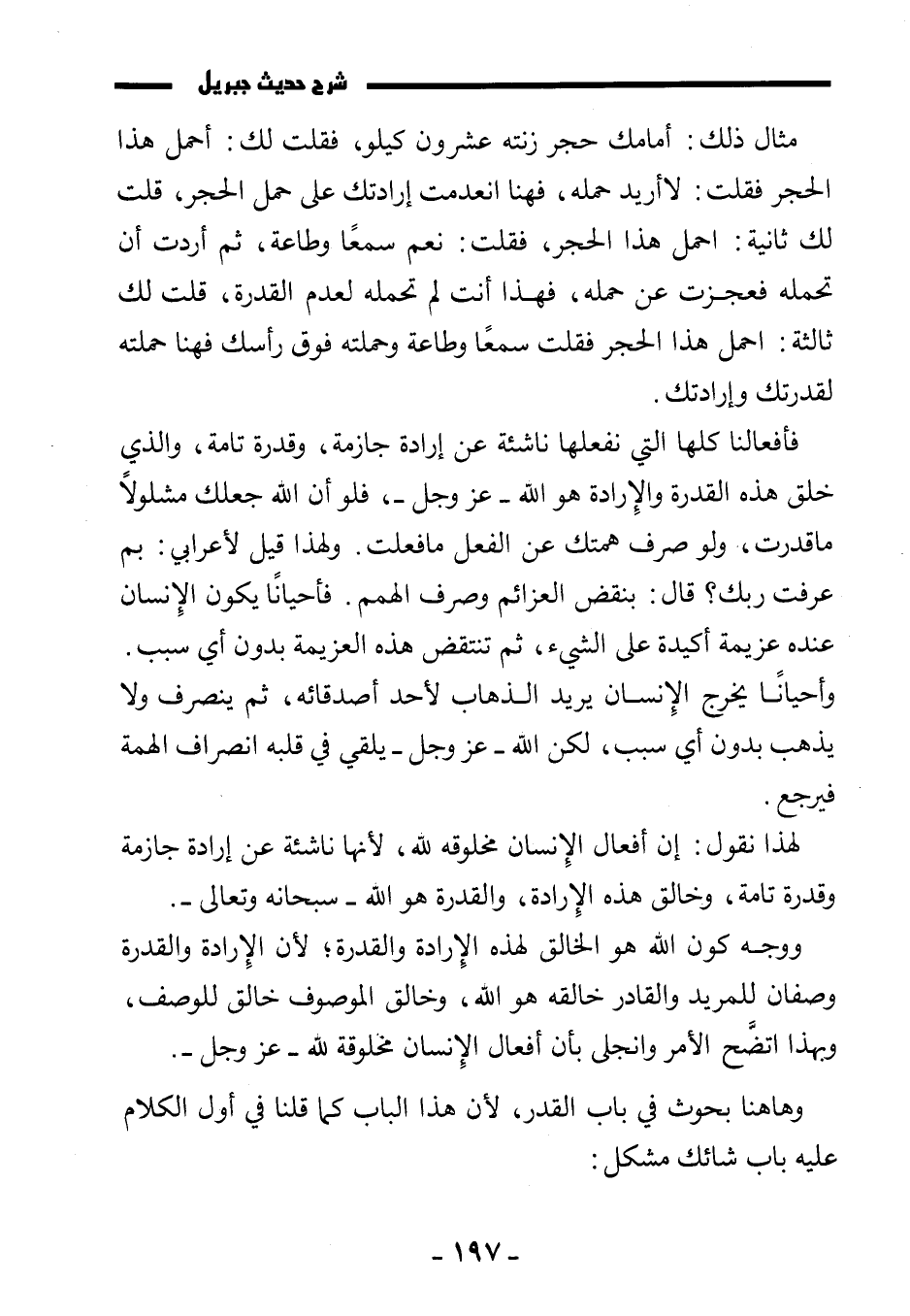 مثال ذلك: أمامك حجر زنته عشرون كيلو، فقلت لك: احمل هذا الحجر فقلت: لا أريد حمله، فهنا انعدمت إرادتك على حمل الحجر، قلت لك ثانية: احمل هذا الحجر، فقلت: نعم سمعا وطاعة، ثم أردت أن تحمله فعجزت عن حمله، فهذا أنت لم تحمله لعدم القدرة، قلت لك ثالثة: احمل هذا الحجر فقلت: سمعا وطاعة وحملته فوق رأسك فهنا حملته لقدرتك وإرادتك.